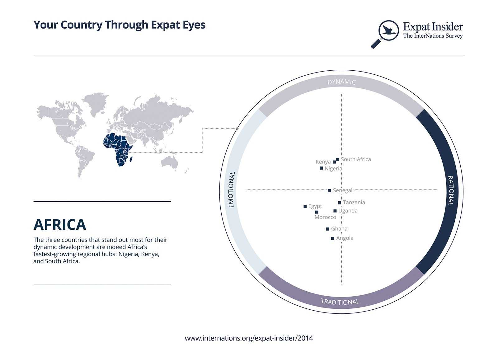 On the African continent, we note a rather interesting divide among the perceptions of expat residents. The three countries standing out most when it comes to dynamic development are indeed some of Africa’s fastest-growing regional hubs: Nigeria in the west, Kenya in the east, and South Africa on the cape.