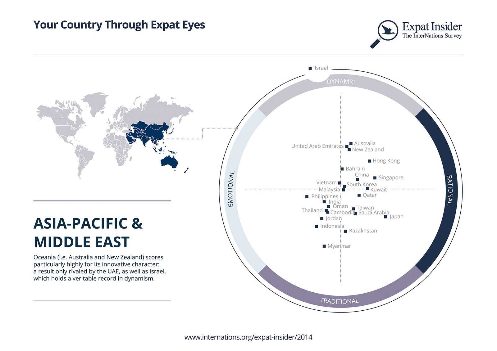 How do expats see their local neighbors and their new home? This chart visualizes how expatriates describe various countries across the Middle East, Asia, and Oceania.
