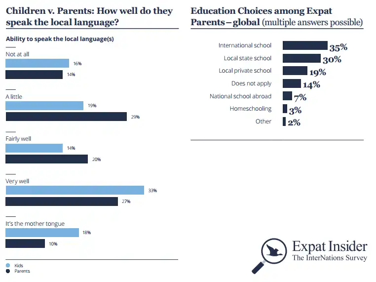 Overall, the highest percentage of expat parents (35%) choose an international school for their children. This result is closely followed by parents who decide to send their children to a local state school (30%). About two in ten parents (19%) enroll their children in local private schools.