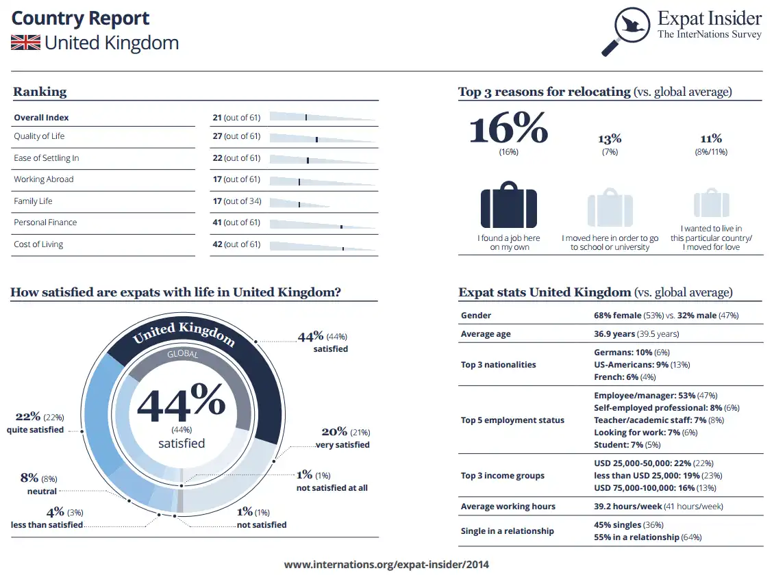When it comes to quality of life, the main downfall of the UK is the climate. A mere 28% of participants describe the weather favorably, which significantly falls behind the global average of 64%. That minor detail aside, the UK has plenty to offer expats.