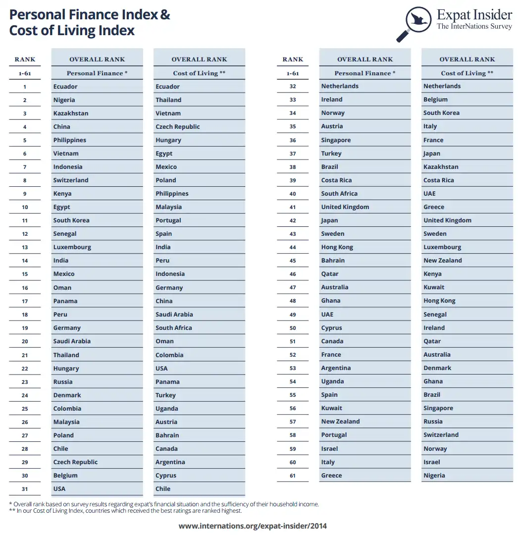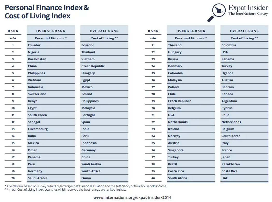 Unlike other cost of living rankings, such as the one provided by Mercer, our index focuses on the participants’ overall satisfaction with the cost of living in their country. The result is a reverse cost of living index, ranking countries with the best costs of living highest. Living expenses were not considered as a factor in the Personal Finance Index, though.