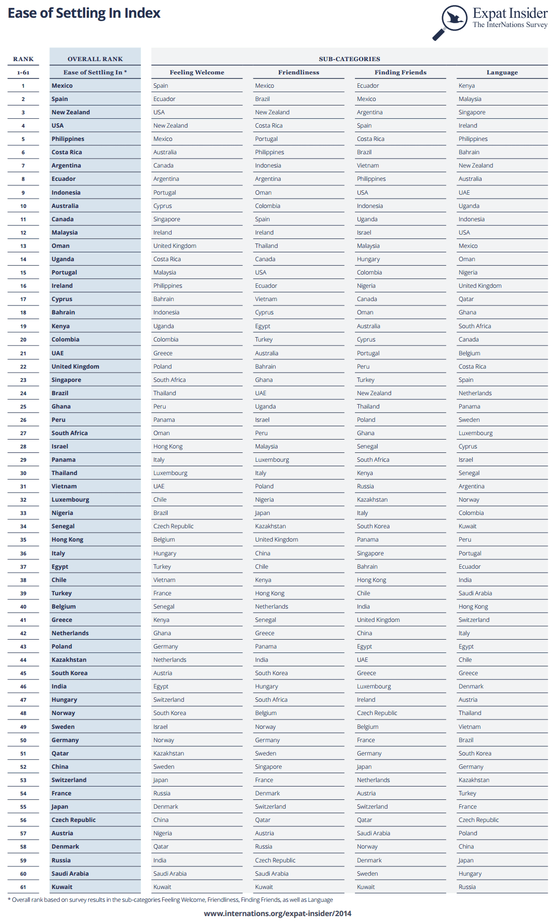 The Ease of Settling In Index combines several “soft topics” – such as how welcome expats feel in their host country, how friendly the local population is, how easy it is for expatriates to make new friends, and how easy and important it is to learn the local language. Survey participants were asked to evaluate these factors on a scale of one to seven. Each country required a sample size of at least 50 survey participants to be featured in the ranking.