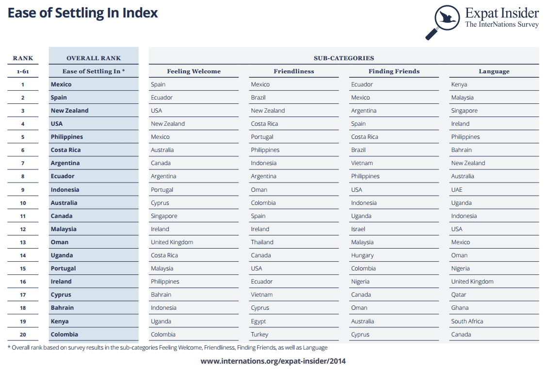Mexico is the friendliest country, Spain welcomes expats with open arms despite the economic crisis, and New Zealand also makes expats feel at home.
