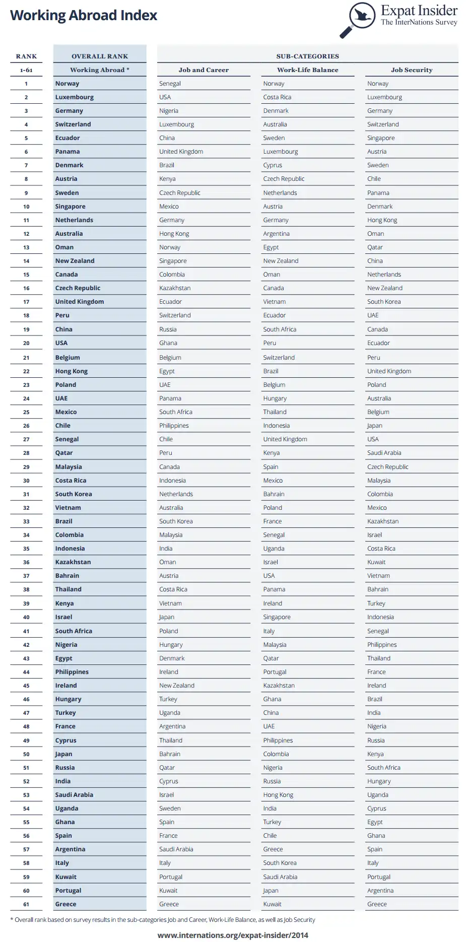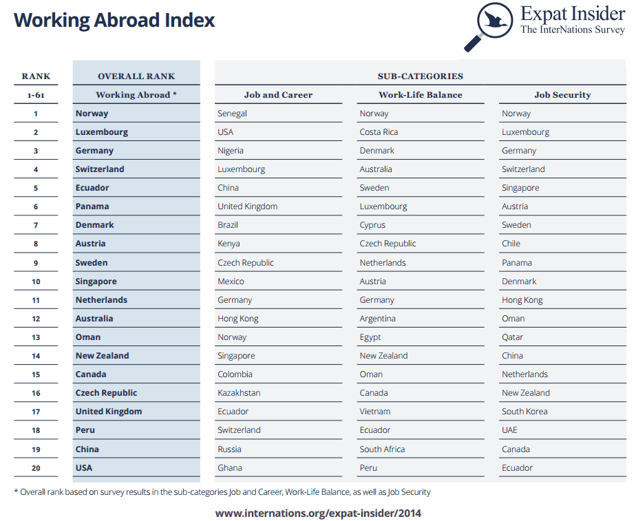 Our Working Abroad Index explores different factors of professional life. It rates over 60 countries according to different aspects, including job satisfaction and career prospects, satisfaction with working hours, work-life balance, job security, and the state of the local economy.