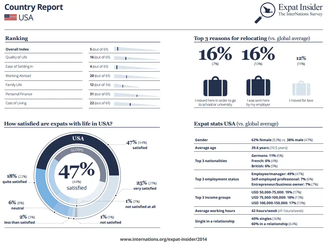 Ranking 5th overall and no lower than 31st in any of our main indices, the United States presents a fun and convenient choice for expats.
