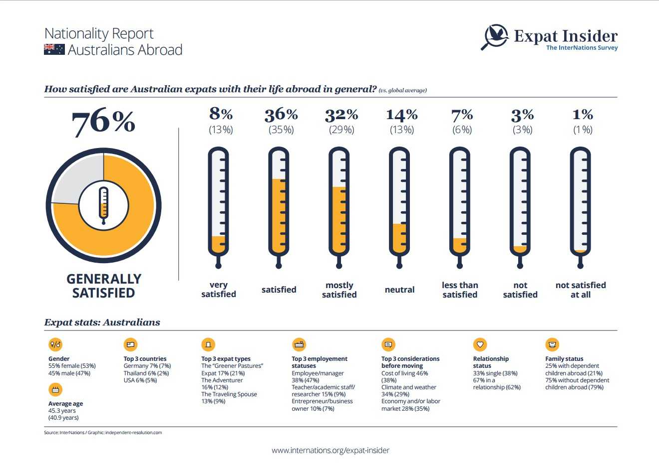 They are likely to be no stranger to expat life, either, as almost four out of five Australian expats (79%) say they have lived abroad before, and 13% state they have lived in five or more countries already. They also like to stay a while, as 22% of Aussies report they plan on staying over five years, and one in seven (14%) has acquired the citizenship of their host county. These numbers are higher than the global averages of 16% and 10%, respectively.