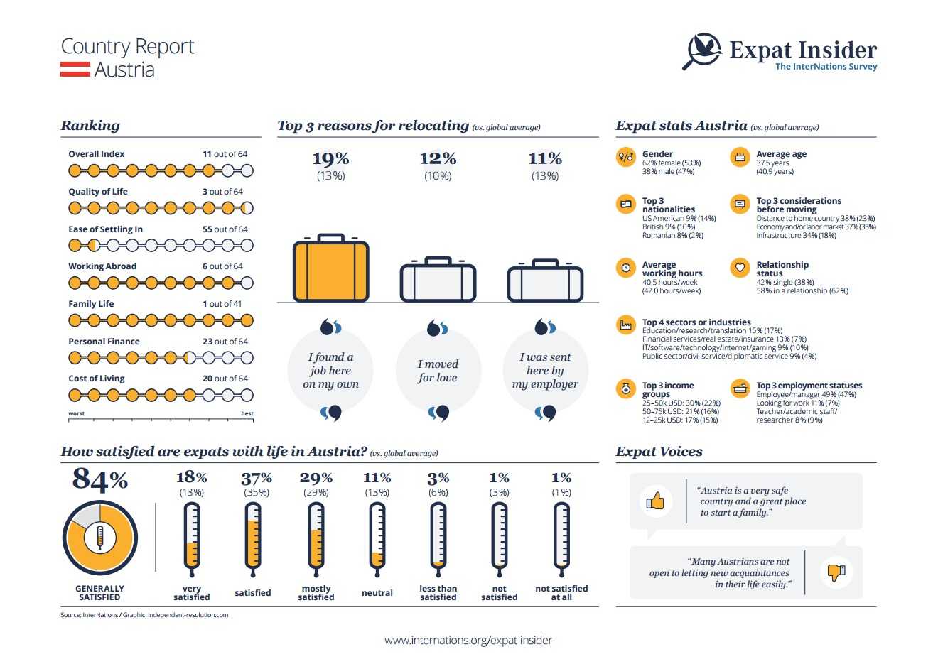 In spite of all these advantages, the expats in Austria do not seem to be happy, though; the ranking in the Personal Happiness subcategory is only 42nd out of 64. This could also be due to difficulties in settling down.