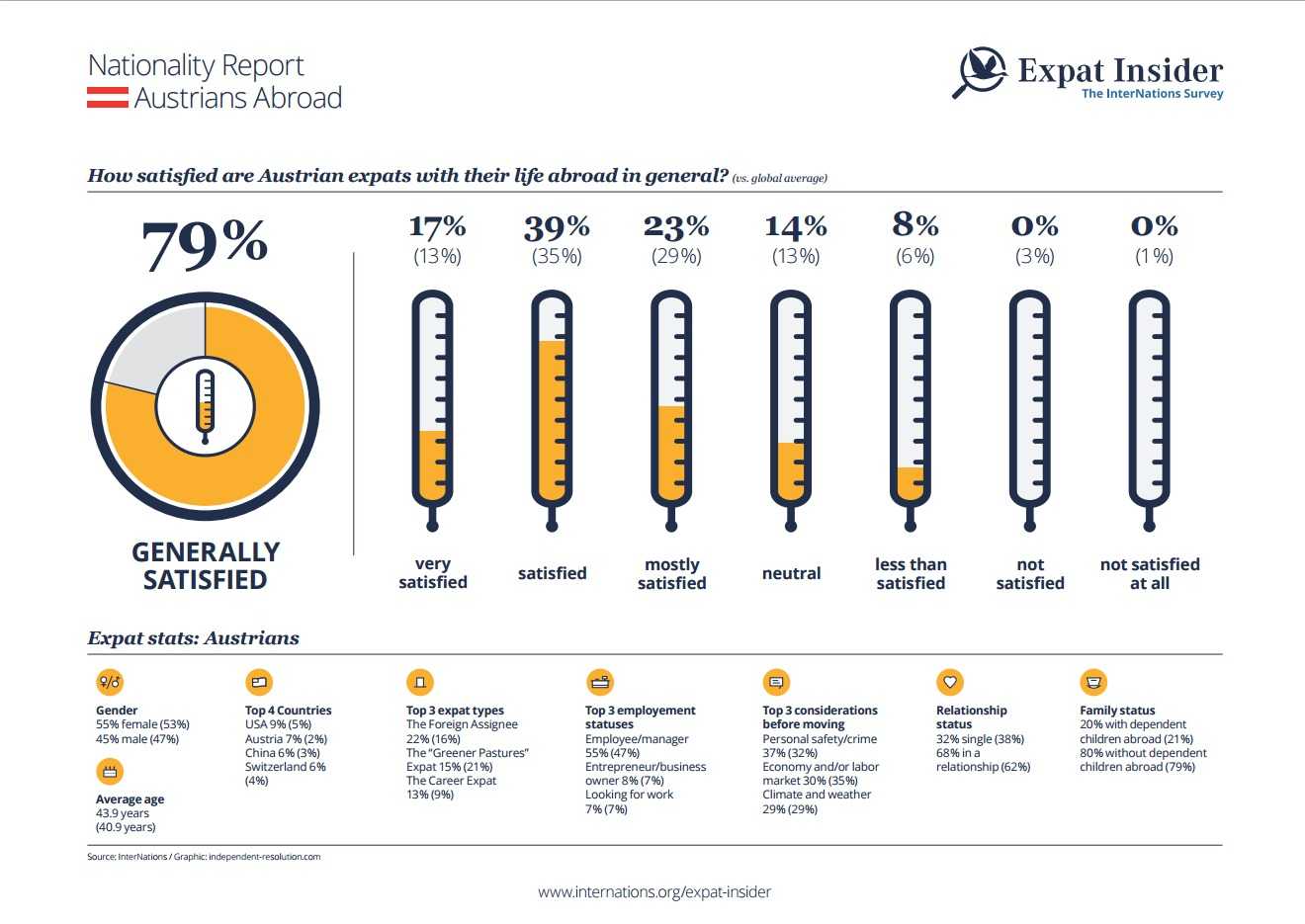More seasoned than some, the Austrian expat is half as likely to be living abroad for the first time as the global average (14% vs. 28%). Once abroad, 28% intend to stay possibly forever.