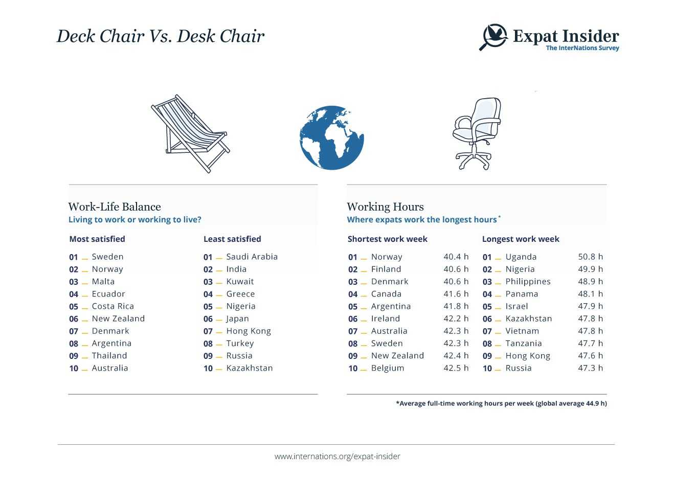 Check out our charts for satisfaction with work-life balance and weekly working hours to discover where expats have to live for work – and where they can work to live.