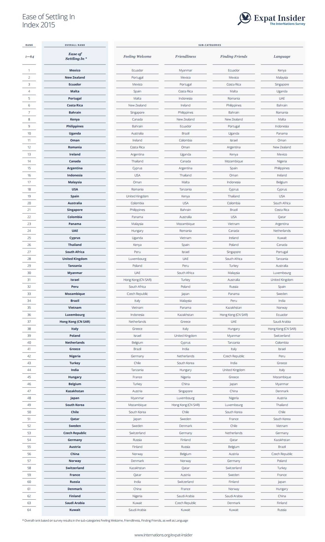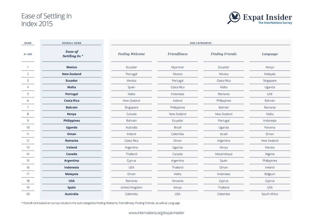 Mexico has successfully defended its title this year as the country where it’s easiest to settle in abroad. New Zealand rose from third place to second. Ecuador has climbed up five places to come in third. Spain, which ranked second in 2014, has dropped out of the top ten completely and is now down at spot 19. This is mostly due to a big drop in the Friendliness subcategory, where it went from 11th to 26th place. The country also lost ground when it comes to finding friends and feeling welcome. One of the biggest gainers this year is Portugal, which climbed ten spots to claim fifth place.