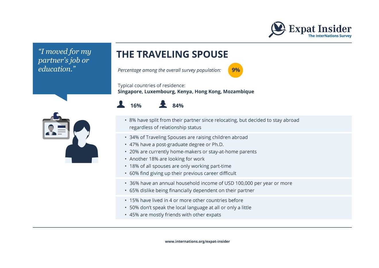 Traveling Spouses moved abroad to follow their partner or spouse and for 79% of them it was even the main reason for their move. About 9% of all survey respondents are Traveling Spouses, and 84% of them are women. Moreover, most Traveling Spouses are British (13%), US American (13%), or Indian (6%). The destinations in which expat spouses are slightly overrepresented include, among others, Hong Kong, Kenya, Luxembourg, and Singapore, where up to 18% of our respondents are Traveling Spouses.