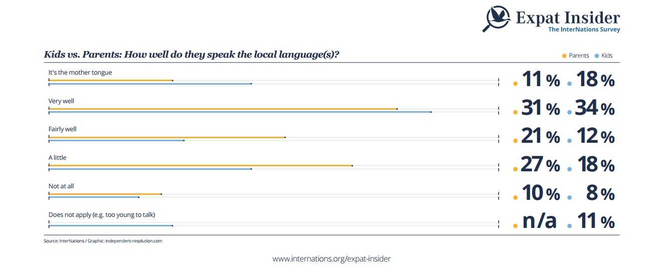 The survey participants were asked various questions about how many languages they speak (including their mother tongue), how well they speak the local language, and how difficult it is to get by without being able to speak the local language. Expat parents were additionally asked how many languages their children are being raised with and how well their children speak the local language.