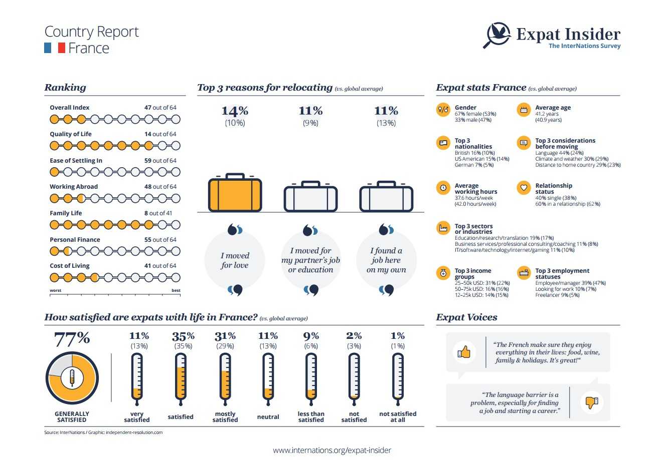 France’s reputation as an exceptionally romantic country is also supported by the survey results. A quarter of the participants in France say that the most important reason for their relocation was related to their significant other: 14% wished to live in their partner’s home country and 11% moved because of their partner’s job or education.