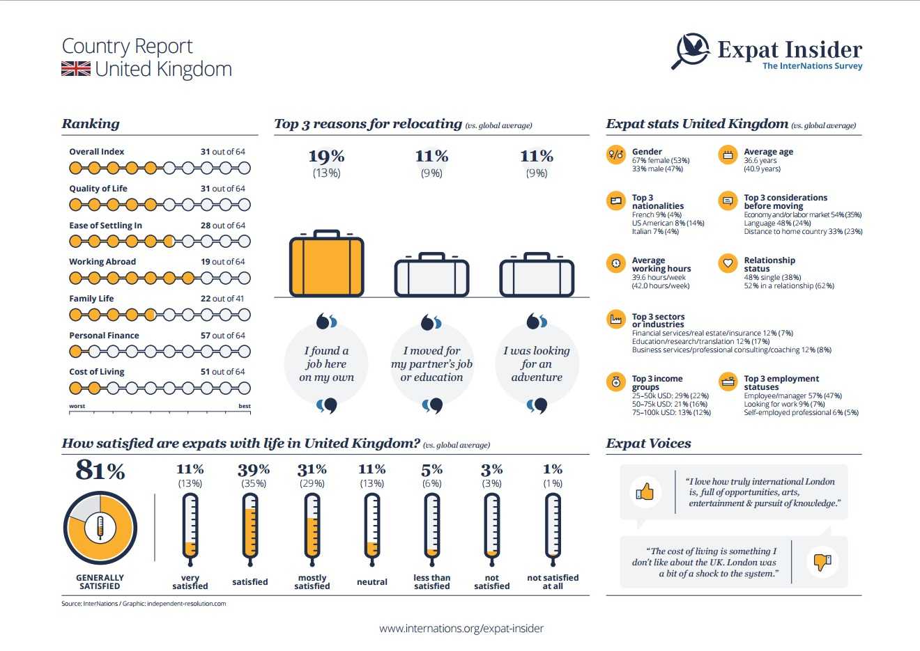 The two most popular reasons for people moving to the United Kingdom relate to either a local job that expats have found on their own, or the career opportunity of a partner. Indeed, the UK ranks seventh in the Job & Career subcategory of the Working Abroad Index. More than two-thirds of the expats (69%) are content with their career prospects, and 63% are generally satisfied with their jobs.