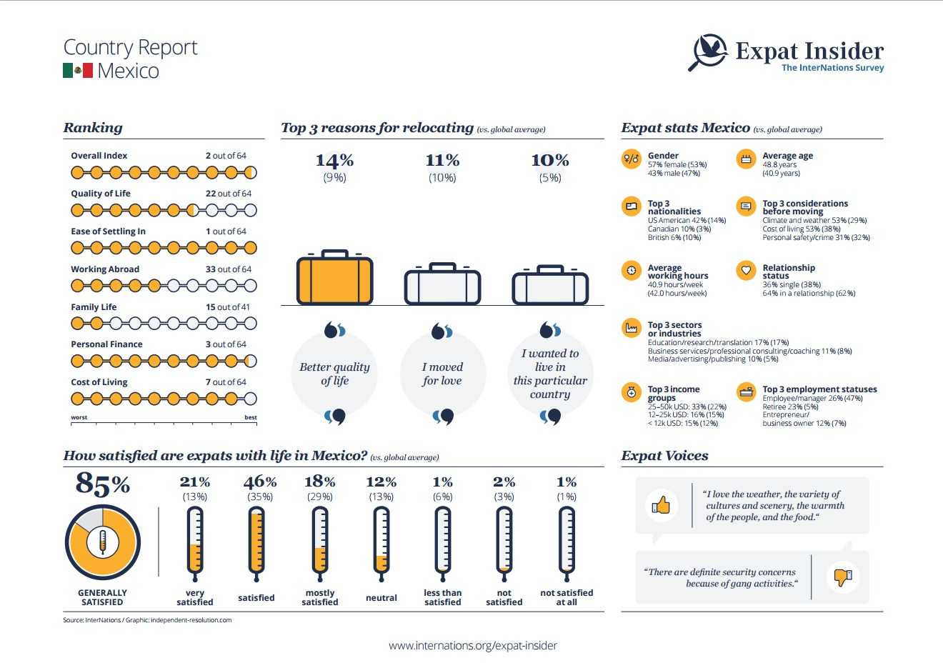 Mexico seems to be a popular place to retire, as it has almost five times as many retirees (23%) as the global average (5%), and over two out of five expats surveyed (41%) say they are likely to stay forever.