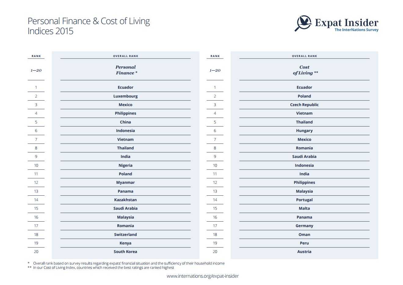 Expats in Ecuador still get the most for their dollar, in Luxembourg high incomes match the steep cost of living, and life in Mexico is affordable even with a modest paycheck.
