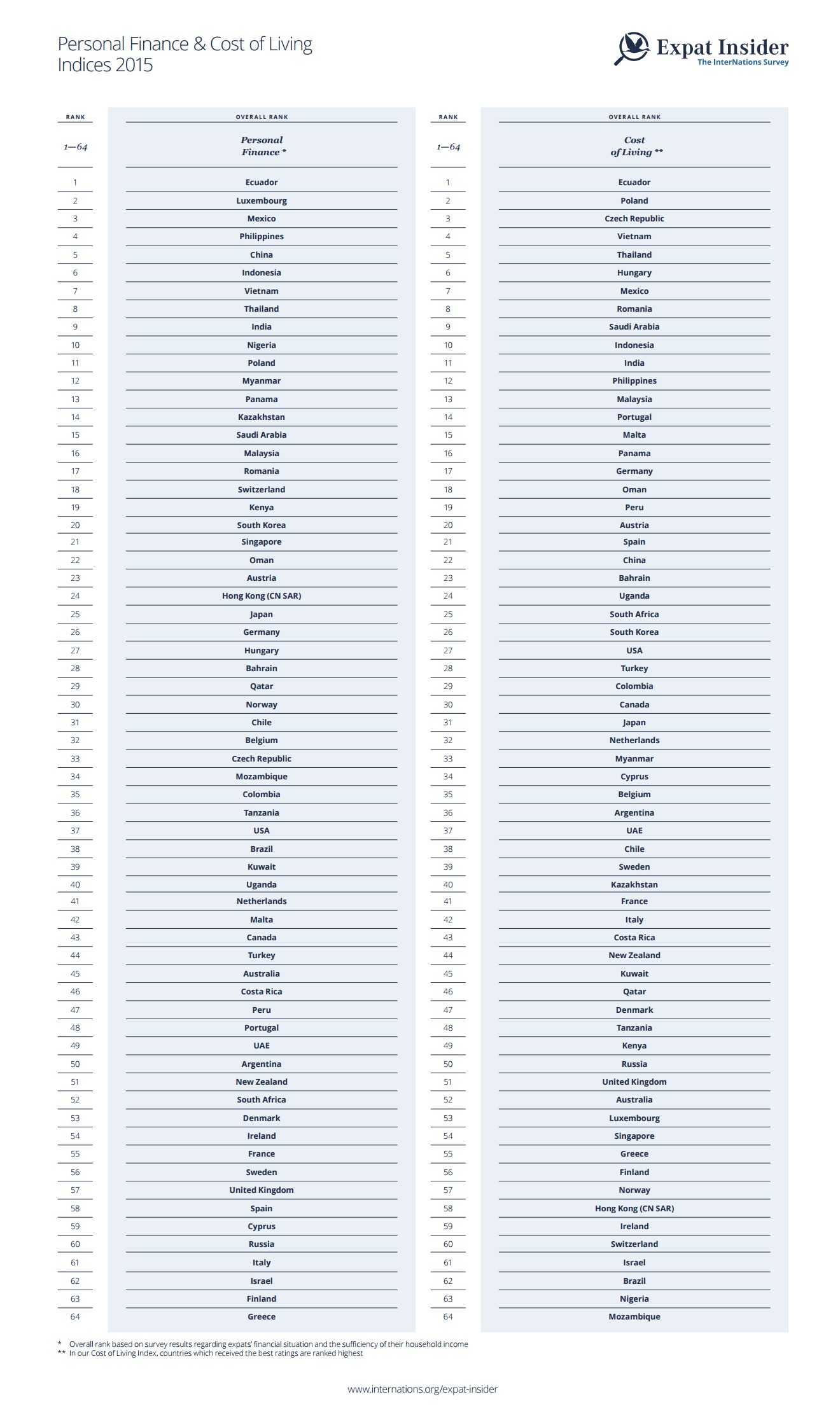 This year a total of 64 countries are featured in the Personal Finance Index. Expats were asked to rate their satisfaction with their personal financial situation and to answer if they feel like their disposable income is enough for their daily life. For the ranking, the first question was given double the weight of the second. A minimum sample size of 50 participants was necessary to be featured in this index, with over 40 countries having over 100 respondents. Questions were rated on a scale of one to seven.