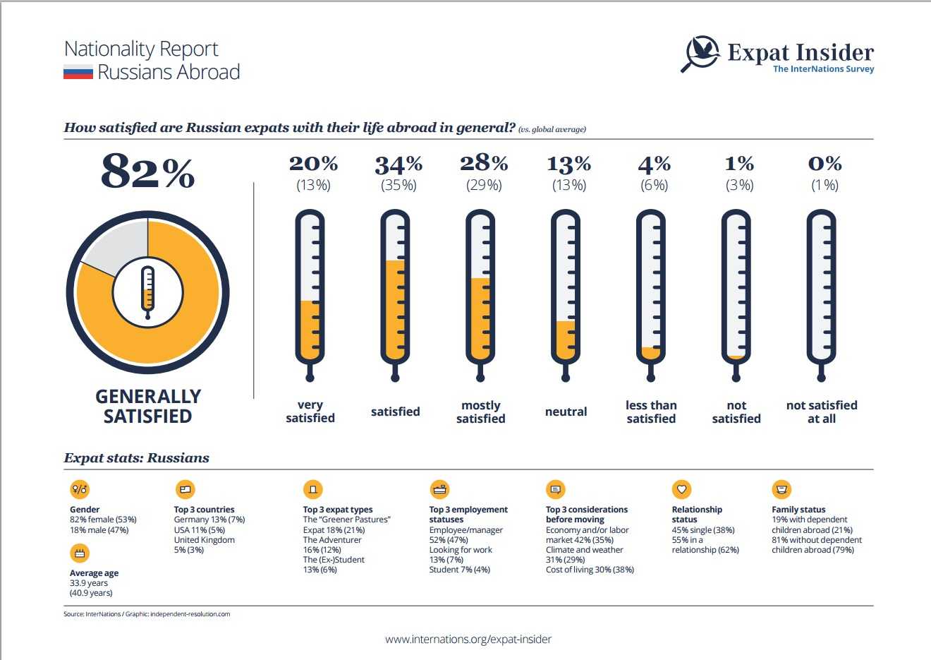 The Russian expat is committed to the cause: 39%, as opposed to one-quarter worldwide, intend to stay forever in their current country of residence. Furthermore, 18% of Russians rather than the 10% among the expat average have acquired their respective foreign citizenship. This is quite a commitment considering the hassle surrounding dual citizenship prompted by new legislation introduced in Russia last year.