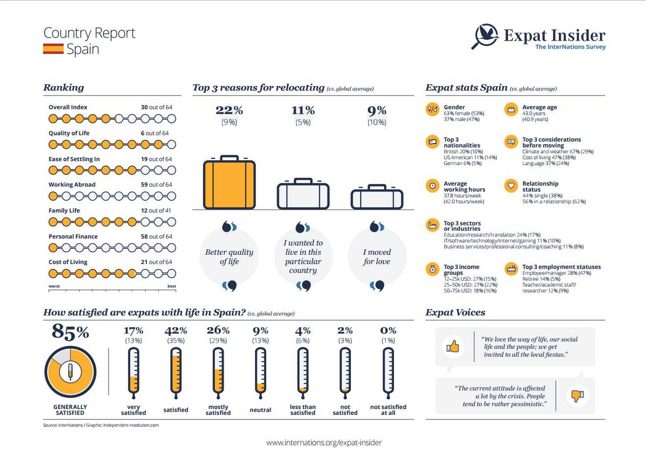 Spain does equally bad in the Job & Career subcategory, as over three out of eight (38%) respondents find their career prospects lacking. Combined, Spain ranks 59th overall in the Working Abroad Index, slightly worse than its ranking in the Personal Finance Index (58th out of 64). However, not everyone comes to Spain for full-time employment.