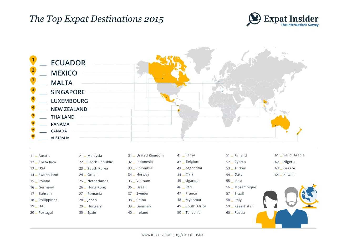 Compared to last year, not much has changed at the top. Ecuador is still a favorite among expats in many respects, occupying first place in our country ranking. Mexico climbed from a good third place in 2014 to an even better second place this year. Malta, on the other hand, only entered the country ranking in 2015 and already holds third place. Luxembourg, the second country on the podium in 2014, only comes in fifth this year.