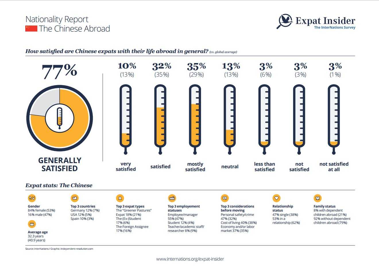 The top expat types are the Greener Pastures Expat (18%) in search of a better quality of life, the (Ex-)Student (17%) in pursuit of an international education, and the Foreign Assignee (17%) sent by their employer. The biggest concern for the Chinese expats when moving abroad is their personal safety, as almost half of the respondents (47%) considered it prior to moving, and afterwards almost three-quarters (73%) say they are generally satisfied with it.