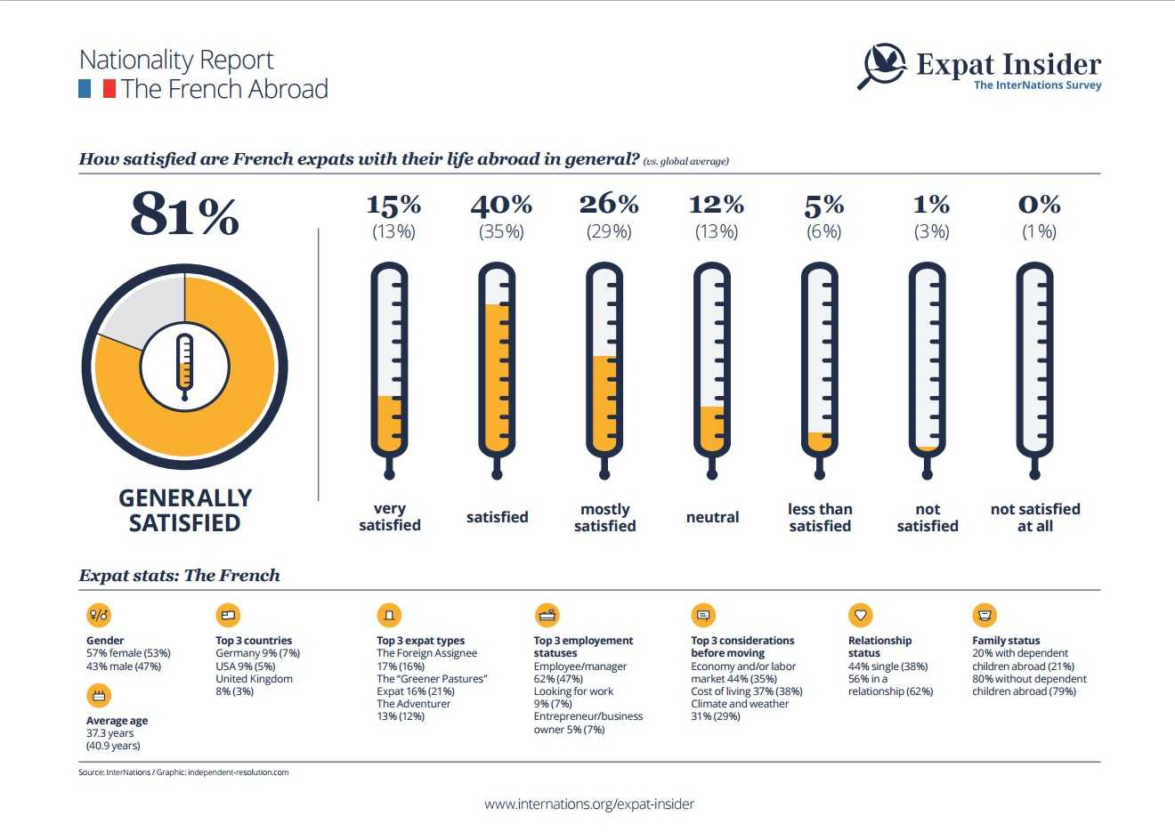 Across the survey, romantic notions of adventure (27%) and the desire to live in a foreign country (26%) are among the top reasons for moving abroad. This romantic attitude is overshadowed by job aspirations when looking at the most important motivations for moving abroad, though. For the French expat, the top three most important reasons are having found a job abroad (16%), being sent abroad by an employer (13%), and, tied for third place, moving for a partner’s job or to live in their home country (both 11%).
