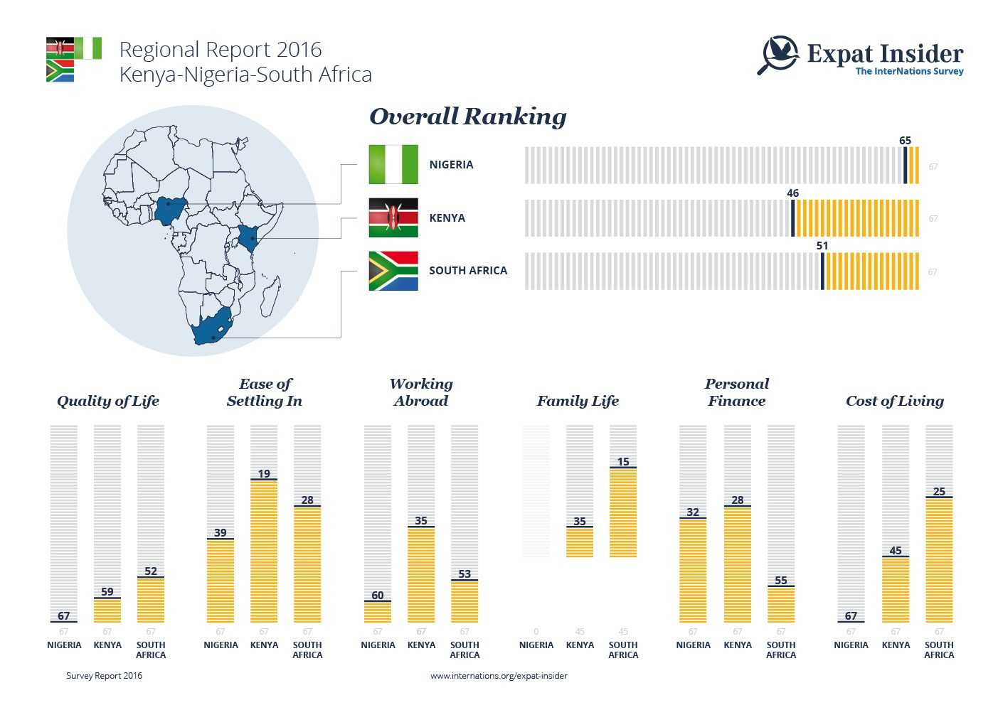 The key African expat destinations are all listed in the bottom ten of the Quality of Life Index: South Africa, Kenya, and Nigeria rank 52nd, 59th, and 67th out of 67 countries, respectively. However, the reasons for these low ratings are very different among the three countries.