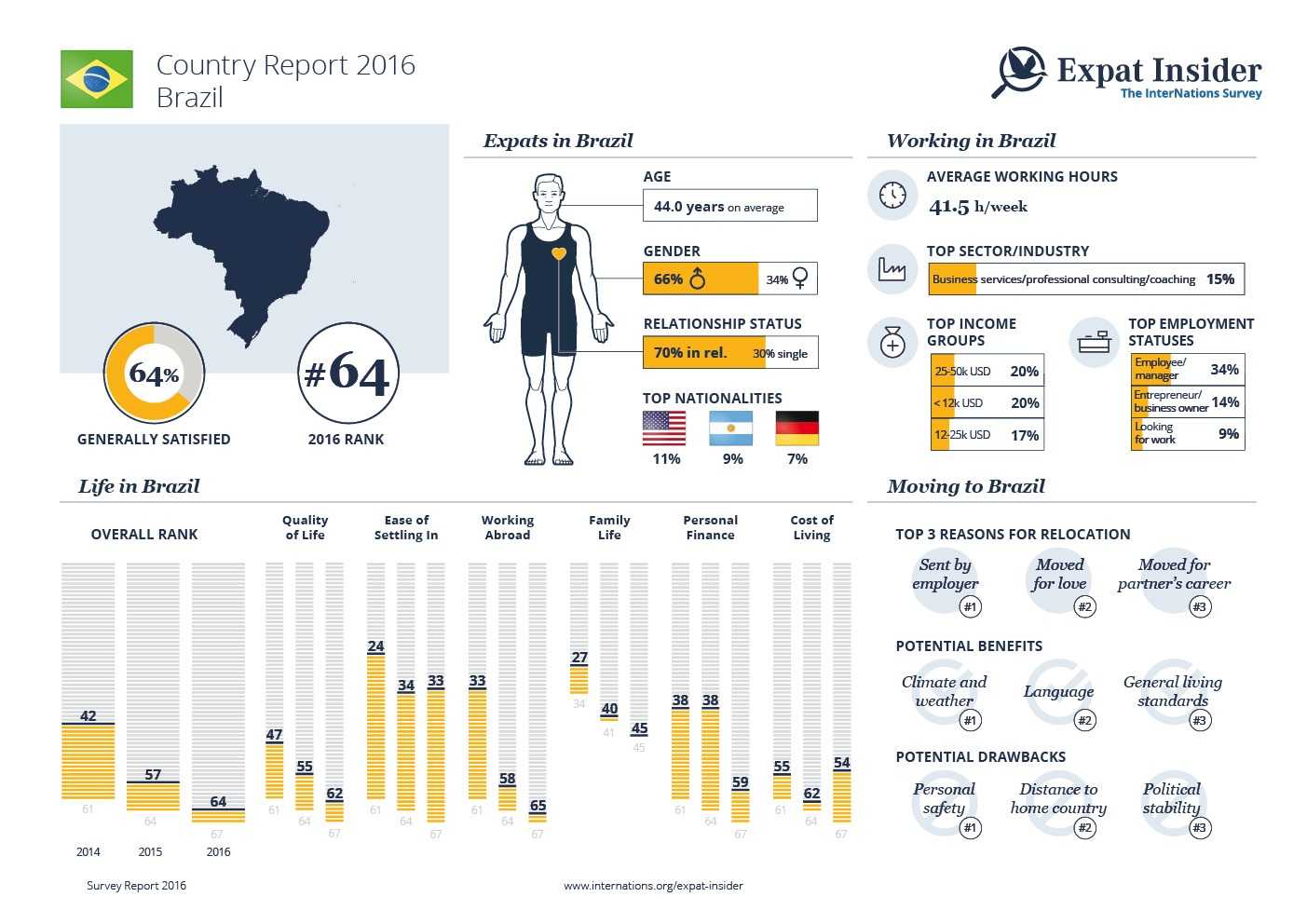 The Working Abroad Index shows another drastic change in opinion among expats in Brazil. From 33rd out of 61 in 2014, the country has fallen to 65th out of 67 countries in this year’s Expat Insider survey. In the Job Security subcategory of the index, Brazil comes 66th, with 85% of respondents giving the state of the economy a negative review, reflecting reports on rising unemployment and falling real wages in 2015 and 2016. It seems hardly a surprise then, that 11% of expats in Brazil say they are not at all satisfied with their job security, nearly double the global average of 6%. Similarly, expatriates in Brazil are less enthused about their working hours than respondents around the world (48% vs. a global 61%).