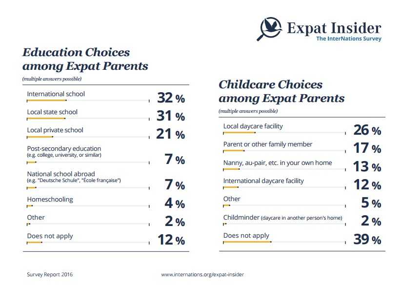 Generally speaking, a large proportion of expat parents choose to send their children to a local daycare facility — 26% compared to 17% whose children are looked after by a parent or other family member and the 13% of expat parents whose children are looked after by a nanny or au pair. Perhaps interestingly, international daycare facilities are the second-least popular childcare option among expat parents, with just 12% choosing this option.