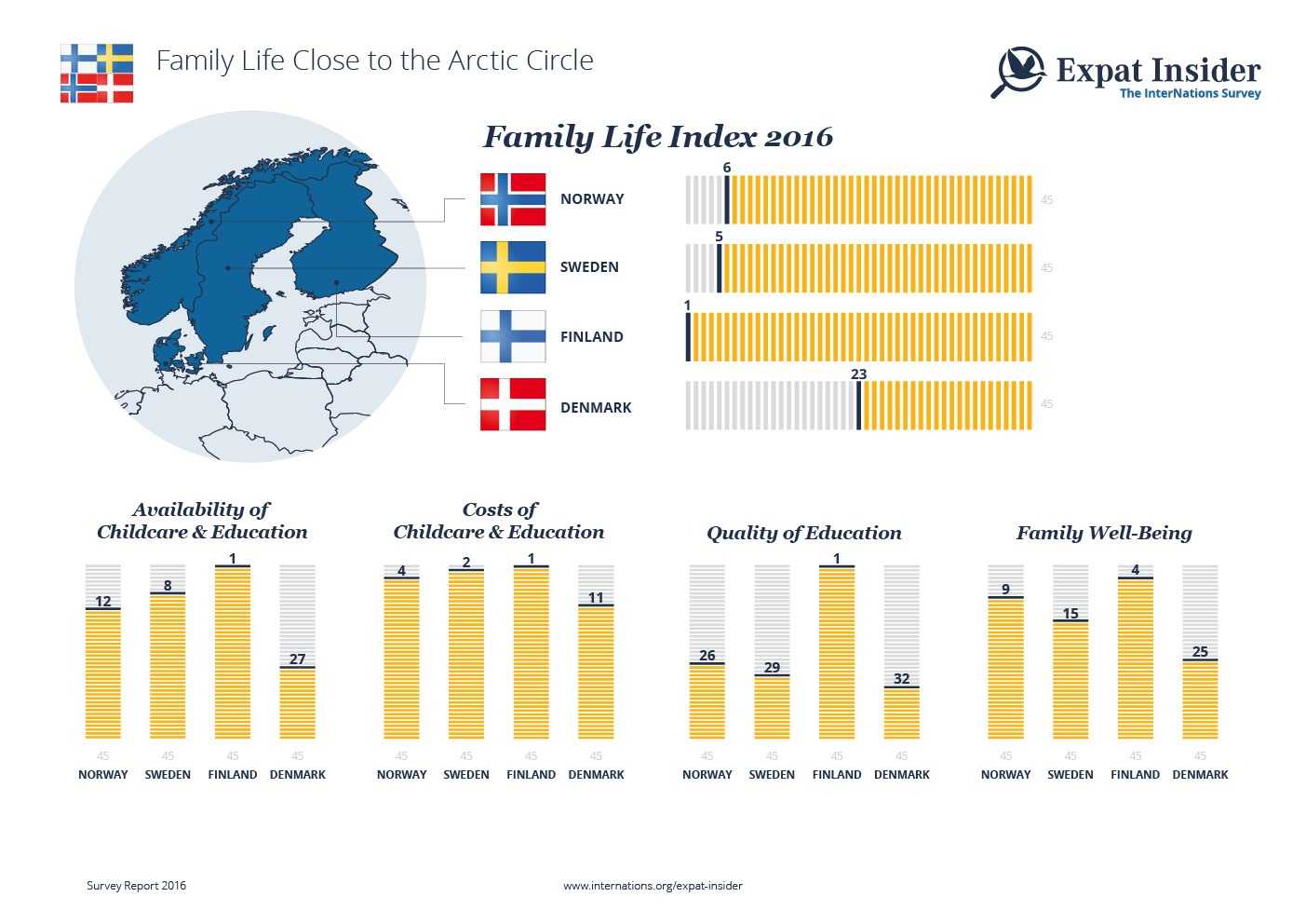 Over the three years of the Expat Insider survey, the Nordic countries have repeatedly performed well in the Family Life Index, often appearing in the top ten. The fact that so many of these countries have ranked in the top ten — top five even — in recent years, as well as their general reputation as family-friendly places, warrants a closer look.