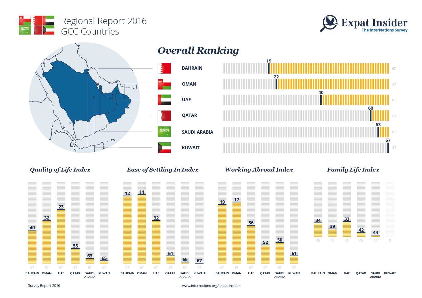 The results among the various destinations in the Ease of Settling Index vary greatly: Oman and Bahrain feature in the global top 15 while Qatar, Saudi Arabia, and Kuwait rank 61st, 66th, and 67th out of 67, respectively.