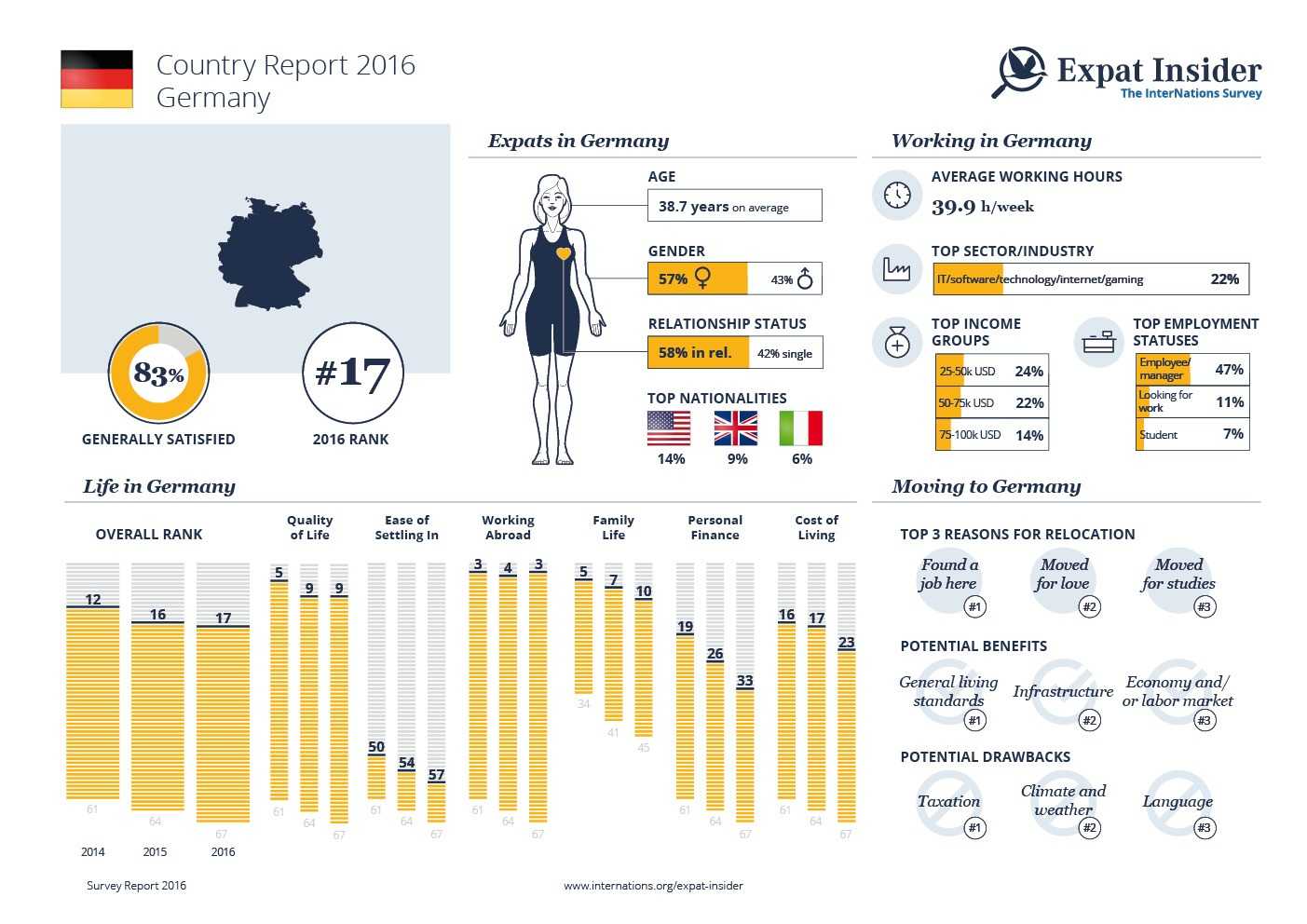 Getting used to the local culture is an ongoing issue among expats relocating to Germany, with the country ranking a lowly 57th out of 67 in the Ease of Settling In Index. The language barrier and the exposure, or lack thereof, to locals come to mind there.