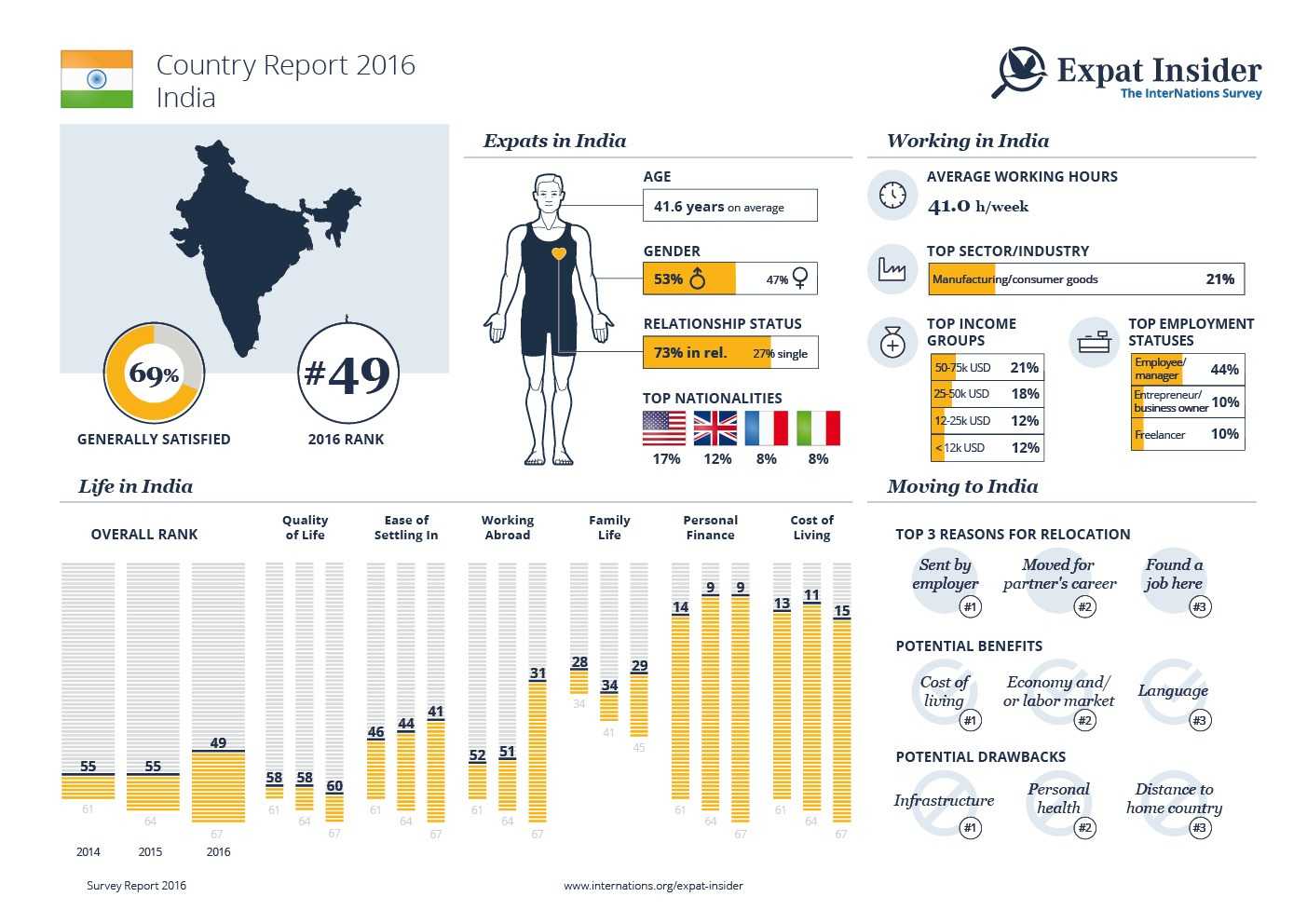 When it comes to work life in India, things appear to be rather stable, with the country ranking an average 31st out of 67 countries in the Working Abroad Index. For instance, 55% of the respondents are satisfied with their career prospects, which is exactly the same percentage as the global average. The Indian economy, meanwhile, is regarded negatively by one-quarter, a percentage that is not too far off the worldwide average of 24%. One noteworthy fact, however, is the full-time working hours per week which average at 46.2 hours, considerably more than the global average of 44.6 hours per week.
