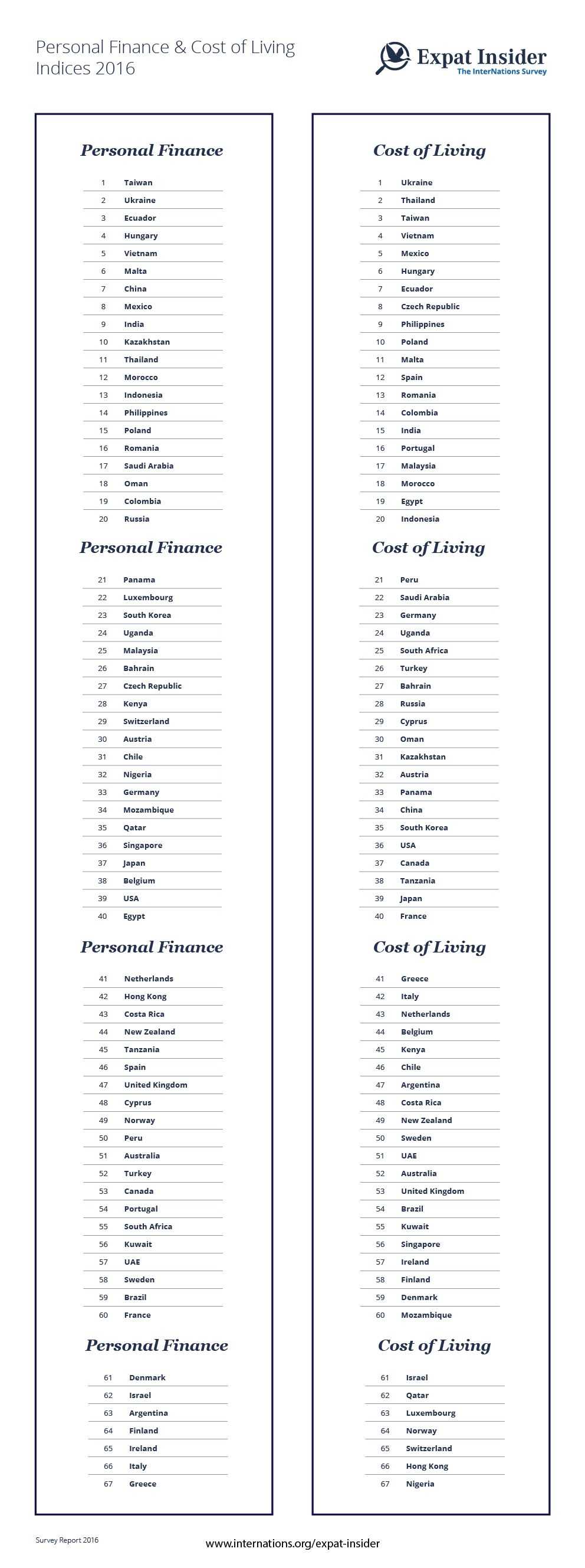 Ireland, which was ranked 54th out of 64 countries in 2015, comes in 65th place out of 67 countries in 2016. One in four expats in Ireland says they are not satisfied with their financial situation overall while close to two in five expats (38%) state their household income is not enough to get by (global: 17% and 23%, respectively).