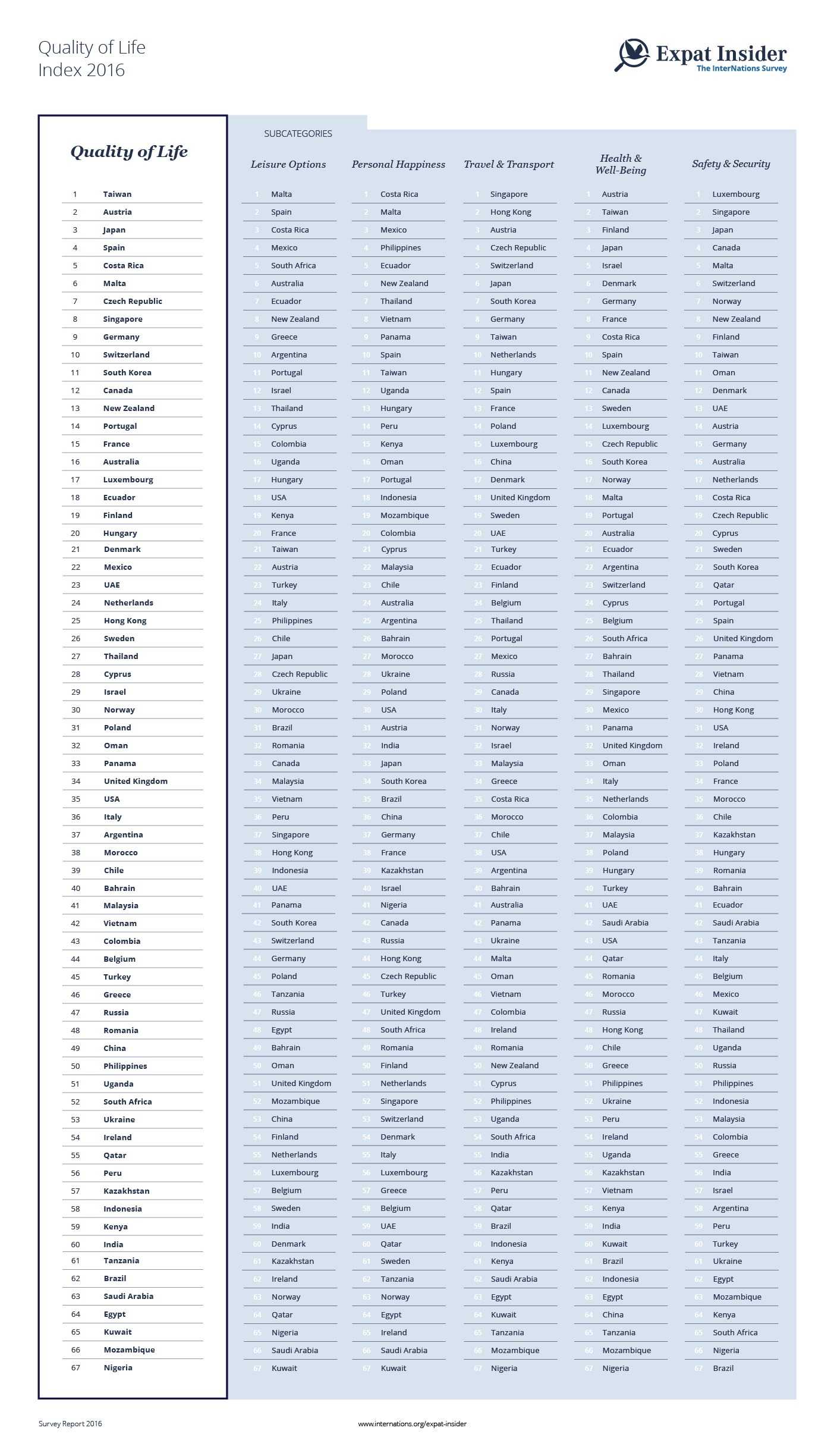 This year, the former Health, Safety & Well-Being subcategory was split into the two separate subcategories Health & Well-Being and Safety & Security in order to better reflect the importance of these areas of expat life. In this spirit, the question about the climate and weather was also moved to the Leisure Options subcategory.