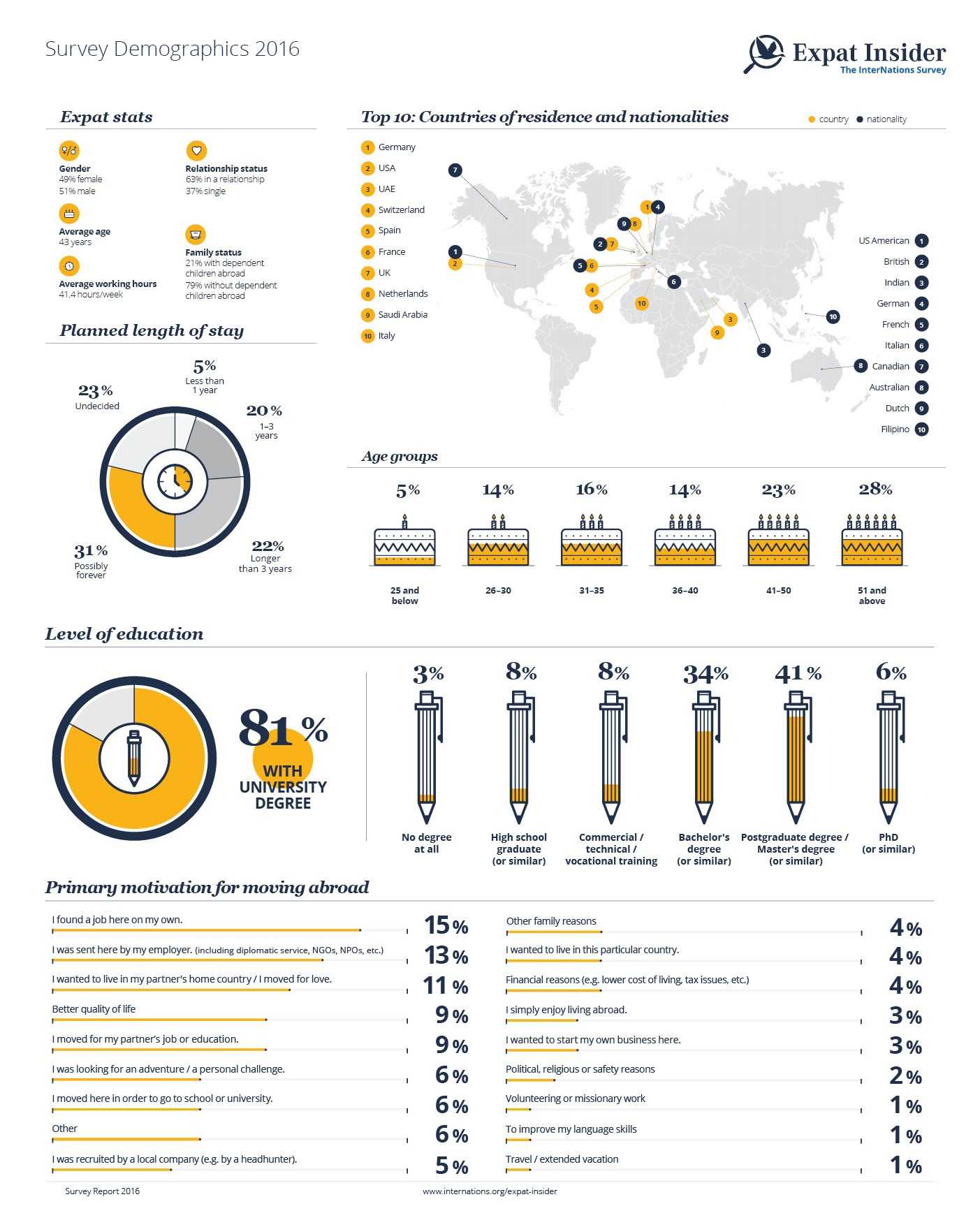These handy infographic sums up the survey participants’ demographics, from age and gender to length of stay and level of education, as well as their primary reason for the move abroad and much more!