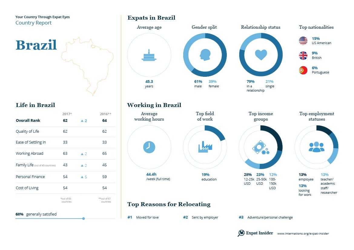 Brazil’s worst performance is in the Working Abroad Index where it ranks 63rd out of 65 countries. Nearly a third of respondents are generally dissatisfied with their career prospects (32%) and job security (31%).