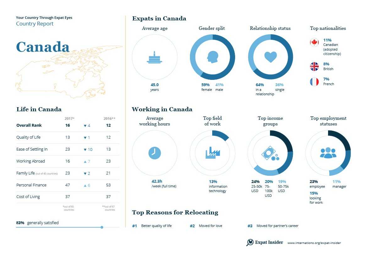 In 16th place, Canada has recovered from its slight dip in 2016’s Working Abroad Index where it ranked 23rd out of 67 countries following two years in the top 15. Expats in Canada are particularly happy with the state of the local economy: 61% even considered it a potential benefit before relocating, and close to three-quarters (73%) give this factor a positive rating (global average: 56%).