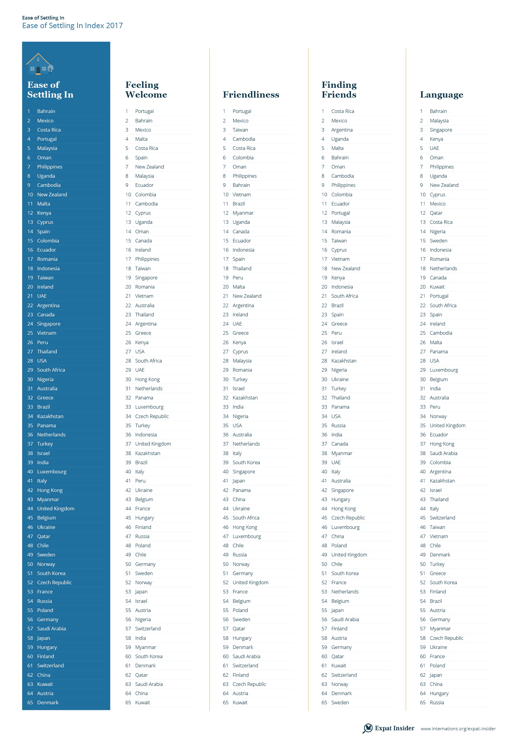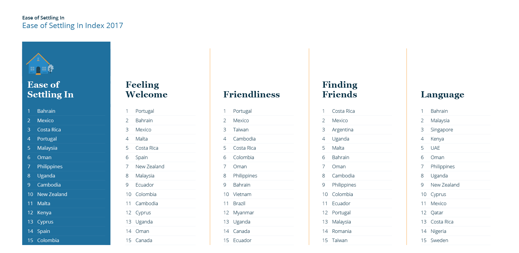 The Ease of Settling In Index covers various “soft” factors that can be vital to making a stay abroad a success. Survey respondents had to rate several factors on a scale of one to seven, including the friendliness of the local population, how easy it is to make friends, how welcome they feel in their country of residence, and how easy and important it is to speak the local language.