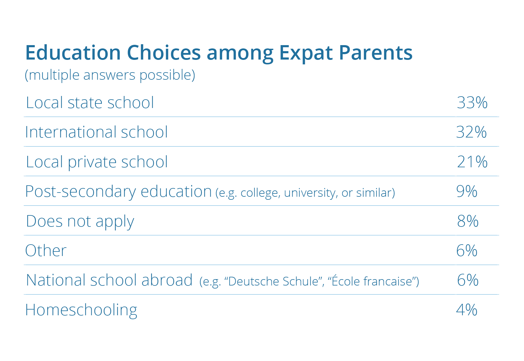 The most popular option among expats is to send their children to a local state school: a third of expat parents with dependent children (33%) choose this type of school for their kids, particularly in Greece, Ireland, and the UK. International school is another popular choice: 32% of expat parents send their children to one, and it’s particularly common in Asia (Hong Kong and Thailand) and the Middle East (Saudi Arabia, UAE, and Qatar).