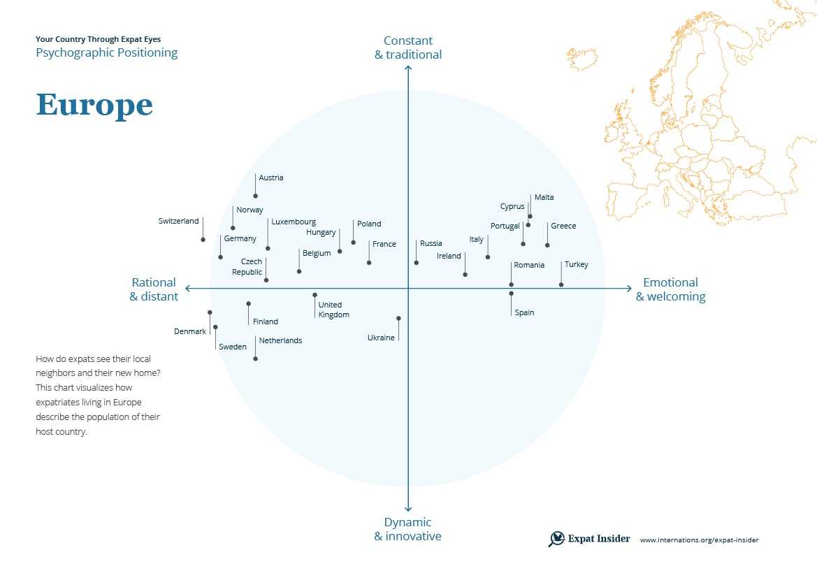 For this series of charts, we asked expats a number of questions about how they’d describe their current country of residence and the local population. Questions included, for example, “would you say they are rather dynamic or constant? More rational or more emotional?” Responses were collected on a rating scale of one to seven.