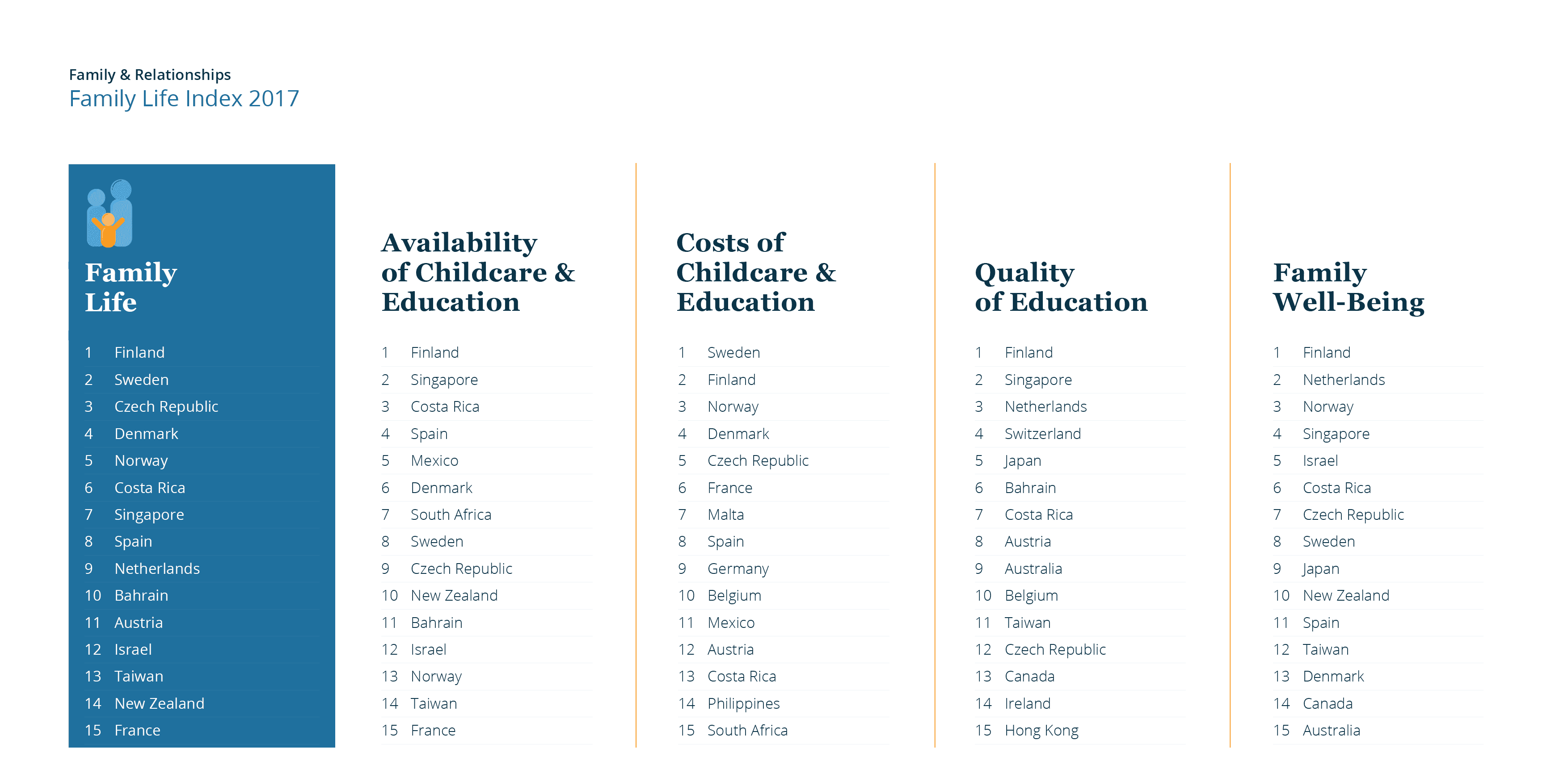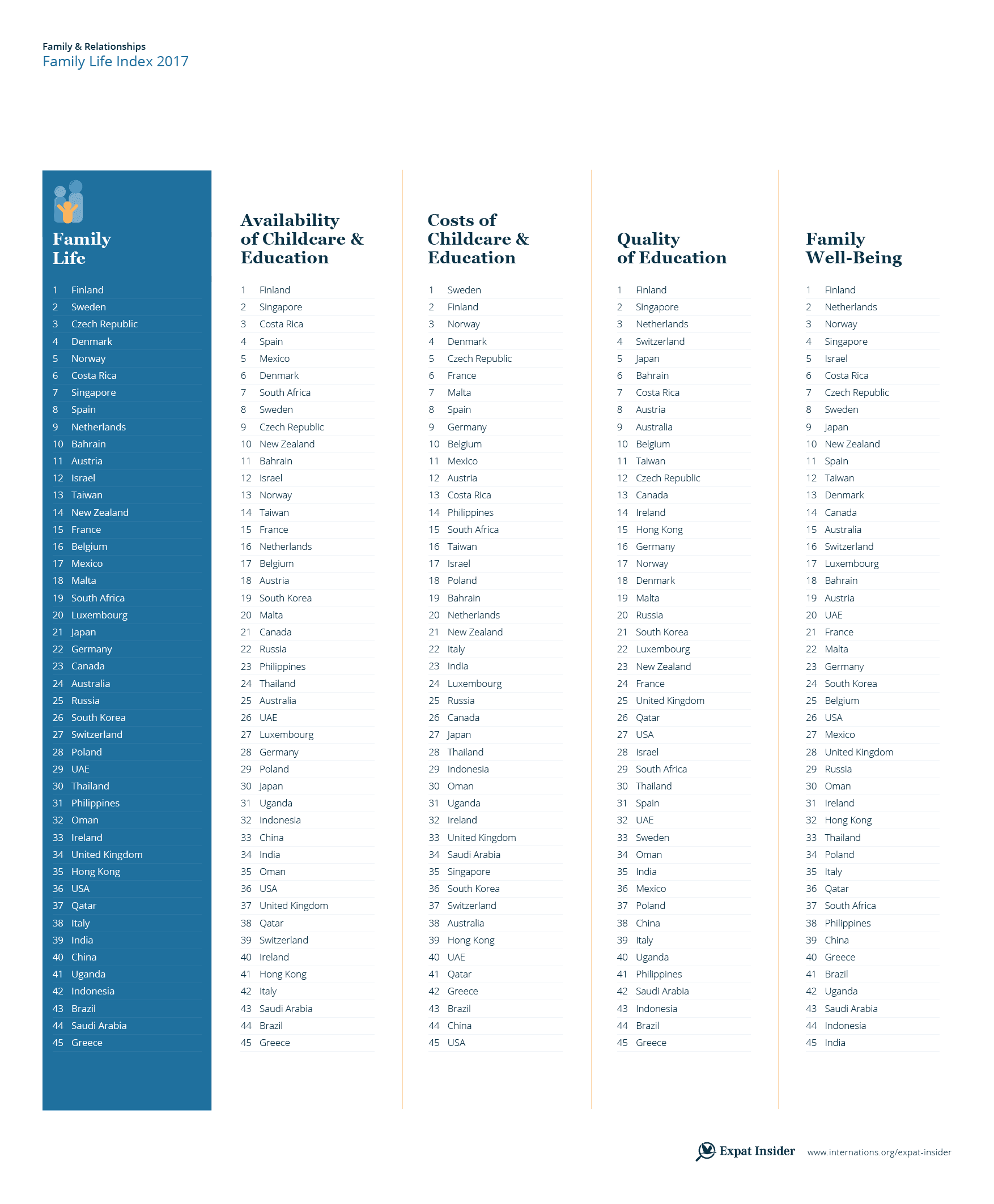 In 2017, 45 countries are included in the Family Life Index. Each country has a minimum sample size of 40 respondents who are raising dependent children abroad. This index covers six different subcategories: availability of childcare & education, costs of childcare & education, quality of education, family well-being, childcare options, and options for children’s education.