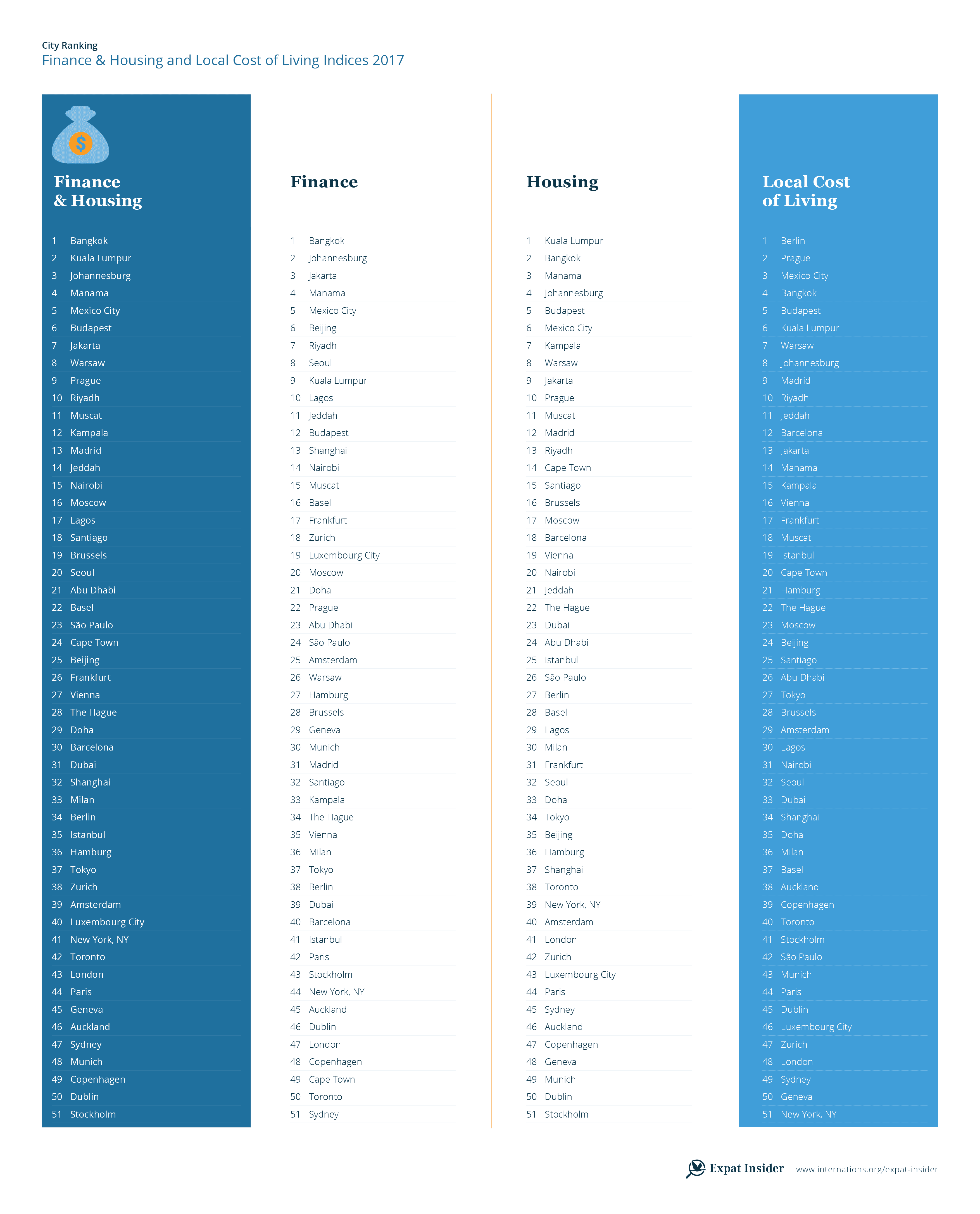 In the Expat City Ranking 2017, 51 global cities are featured in the Finance & Housing Index. The minimum sample size for a city to be listed is 45 survey participants.