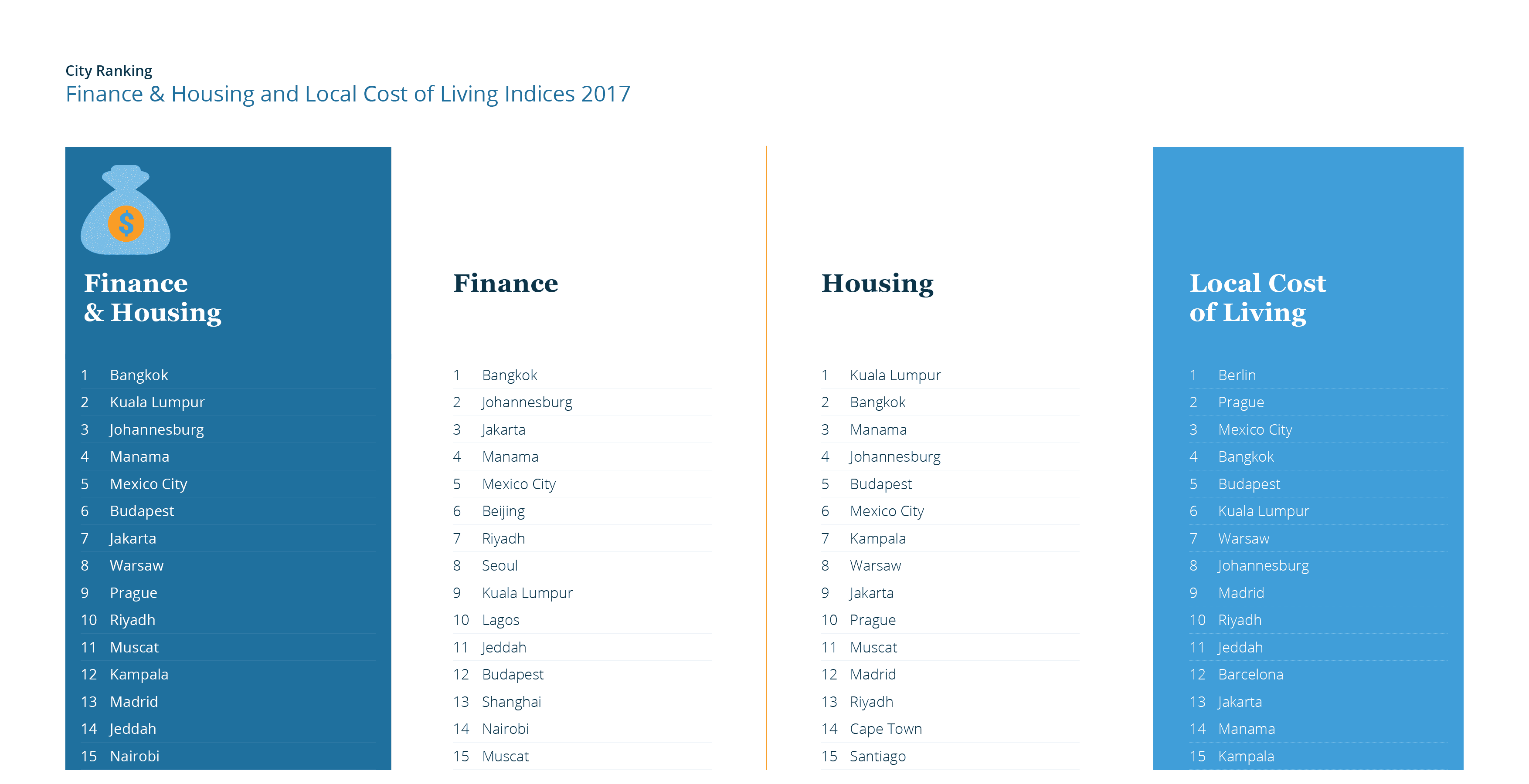 The other two cities in the global top 3 for cost of living don’t share this particularity with Berlin, though. Prague (#2) and Mexico City (#3) do equally well as far as living expenses and finance or housing are concerned.