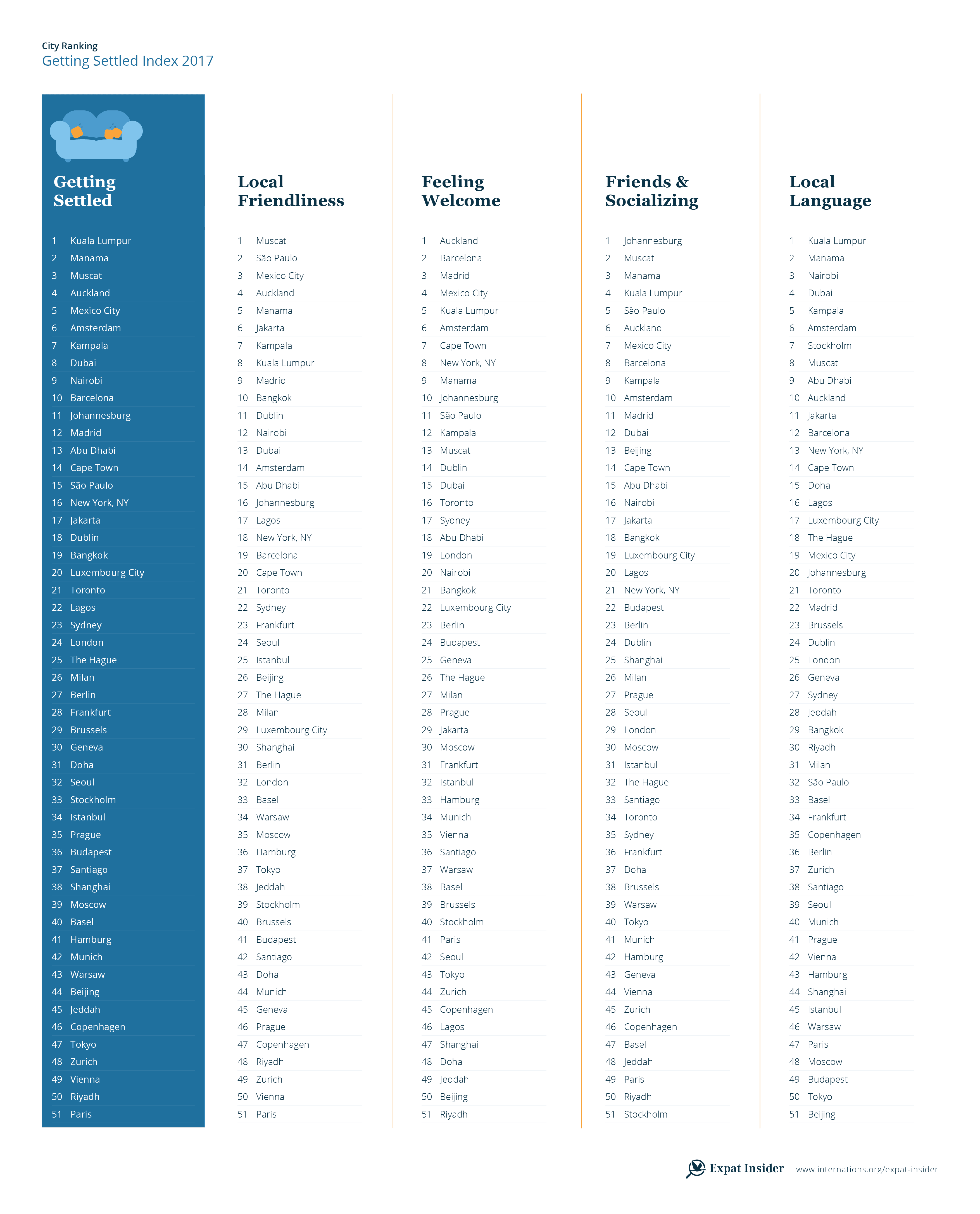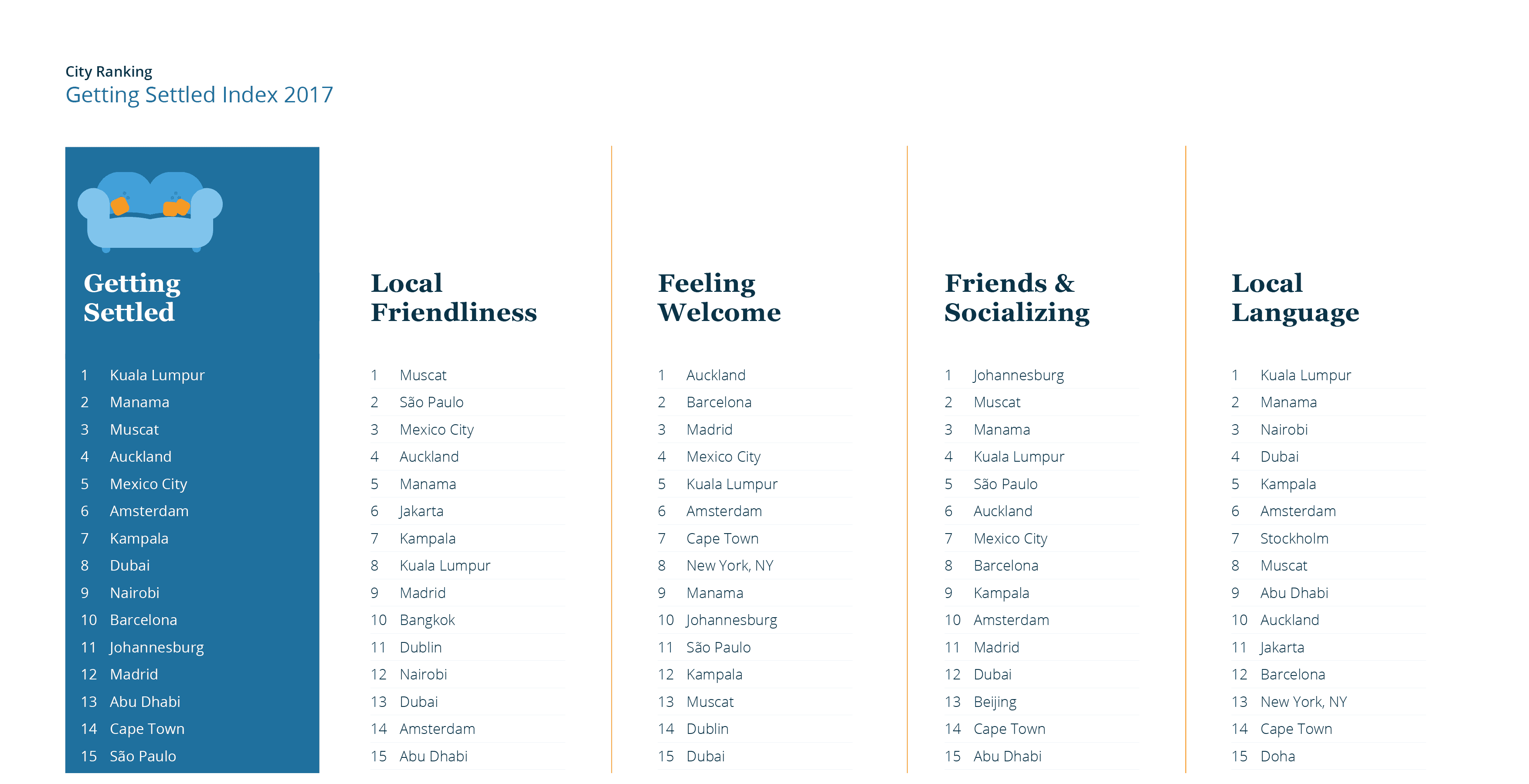 The Getting Settled Index of the Expat City Ranking 2017 covers a range of “soft” factors that can influence how easy it is for expats to find their feet abroad. Respondents were asked to rate their city of residence on a scale of one to seven for several factors. These include, for example, how easy it is to live in the city without local language skills, how happy expats are with their social life, whether or not they feel at home in the city, or how they would rate the general friendliness of the local population.