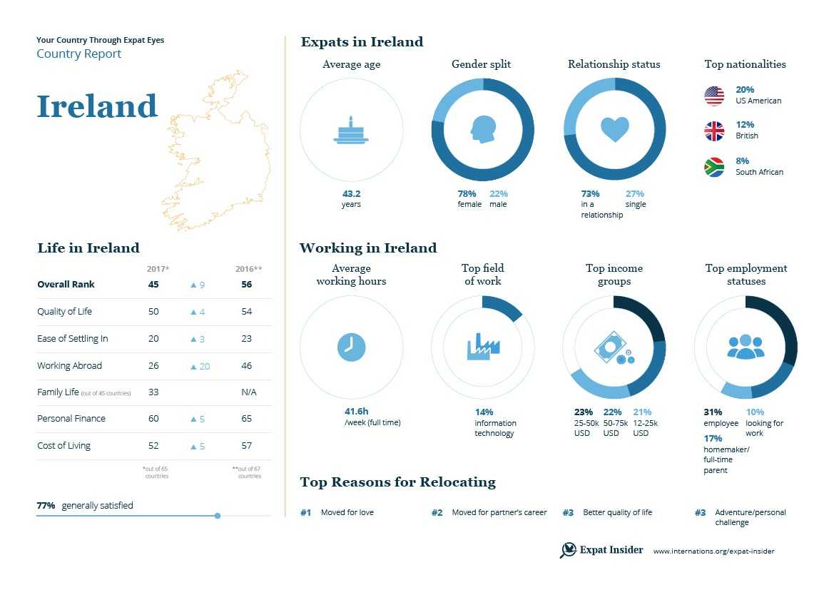 As well as an English-speaking employment pool, low corporation tax has made Ireland especially attractive for international businesses setting up their European headquarters. Dublin has become a virtual tech hub that’s home to LinkedIn, Google, and Facebook. It’s no surprise that IT is a popular career choice for expats, with 14% working in the industry. Outside of Dublin’s very own Silicon Valley, the effects of the recession are finally subsiding and further growth is forecast for 2017 and 2018. Ireland’s prospects have improved considerably in recent years and 65% of expats now rate the state of the economy positively — up ten percentage points from 2016. Expats are also happy in the workplace; nearly two-thirds of expats (66%) say they are satisfied with their job.