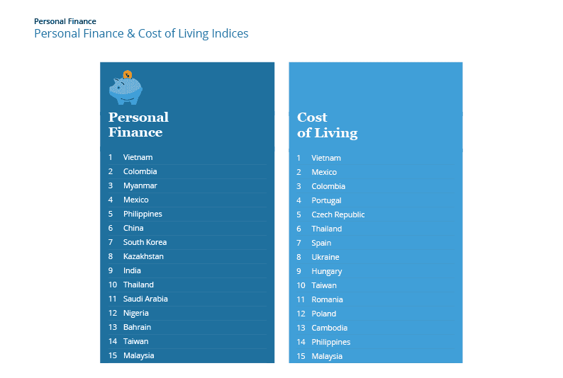 To give a more rounded picture of the respondents’ financial situation abroad, insights from the Cost of Living Index are included in this summary. Due to its similarity with the Personal Finance Index, however, the Cost of Living Index is not included in the overall country ranking; this prevents the financial aspects of life abroad from being overrepresented in the survey results.