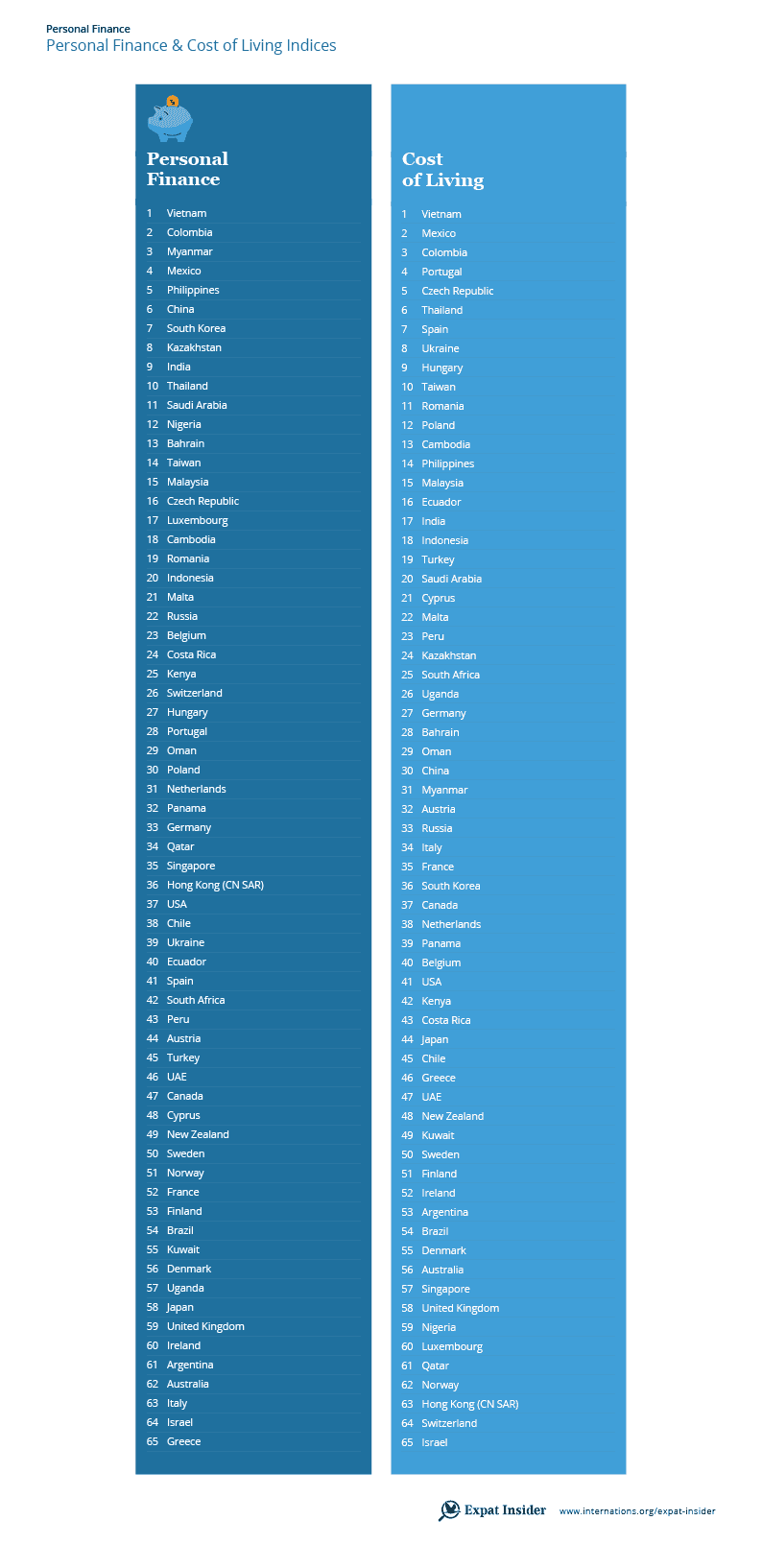 In the Expat Insider 2017 survey, 65 countries are listed in the Personal Finance Index. The minimum sample size for a country to be featured is 75 respondents, but nearly 50 countries have a sample size of more than 100 participants.