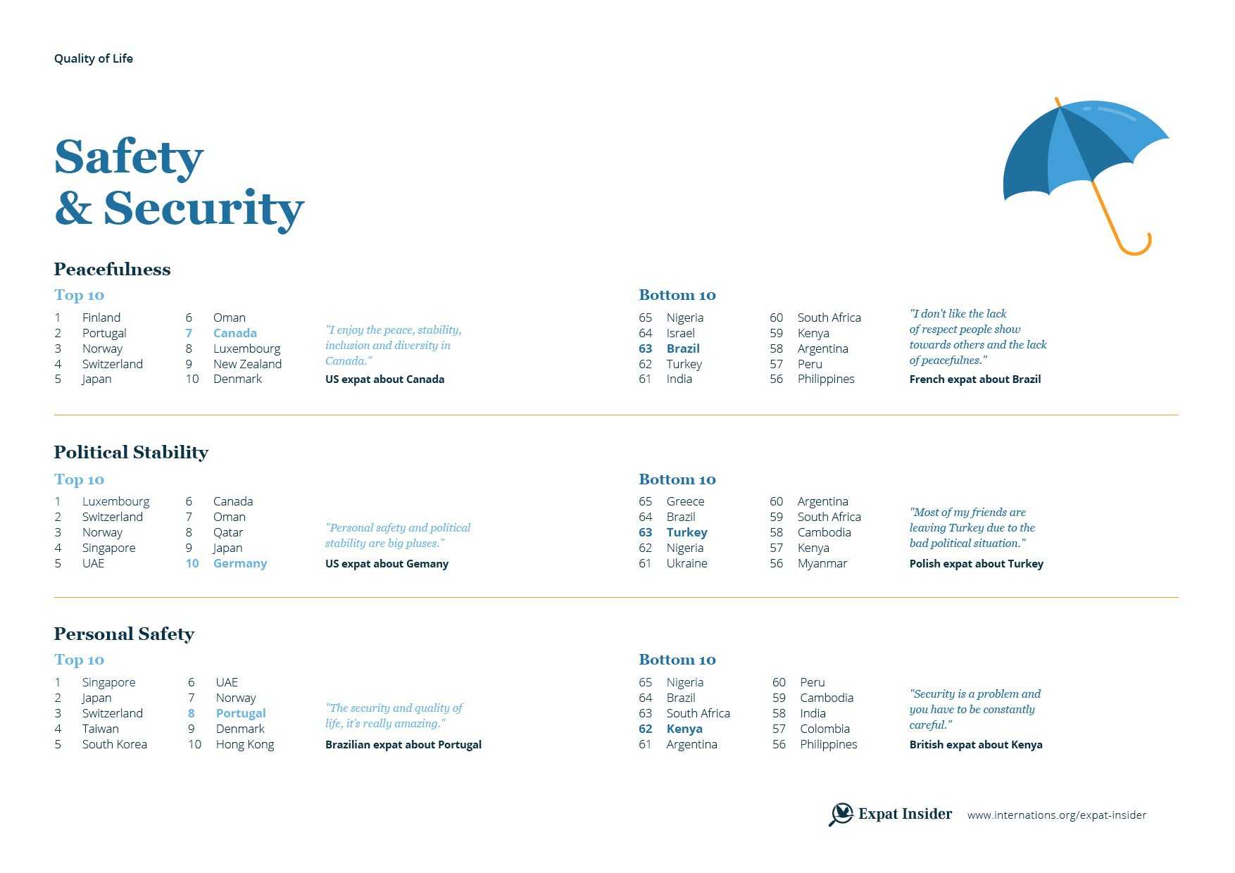 In contrast, India, Turkey, Brazil, Israel, and Nigeria are the countries where expats are most likely to experience conflict. While the latter three were also in 2016’s bottom 5, Turkey has dropped from 58th place out of 67 countries in 2016 to second-to-last in 2017. The attempted coup in 2016 and subsequent ongoing constitutional changes are likely to be the main factors behind Turkey’s negative ratings.