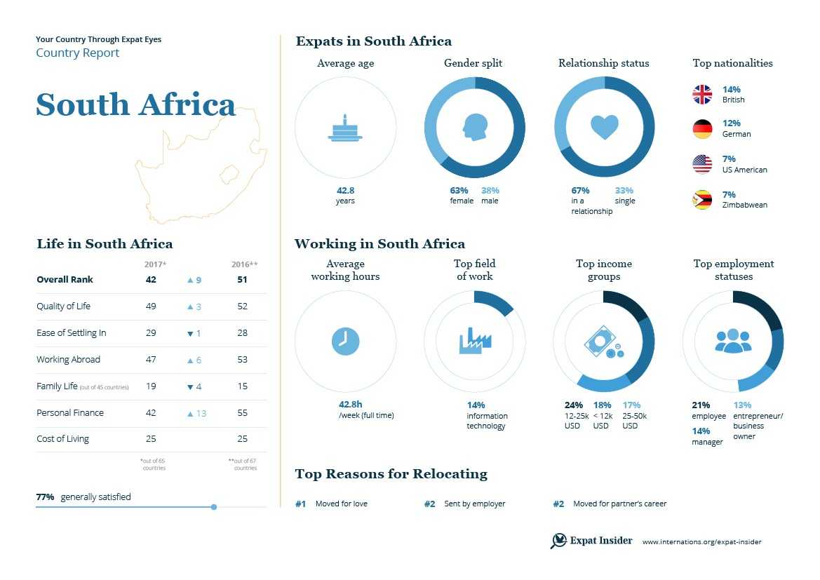 However, two-thirds of expats working in South Africa (67%) are generally happy with their work-life balance, and a further 74% are content with their working hours. One Australian in the country is particularly happy about work, stating “our business … is thriving and [the] low cost of living creates a great lifestyle”.